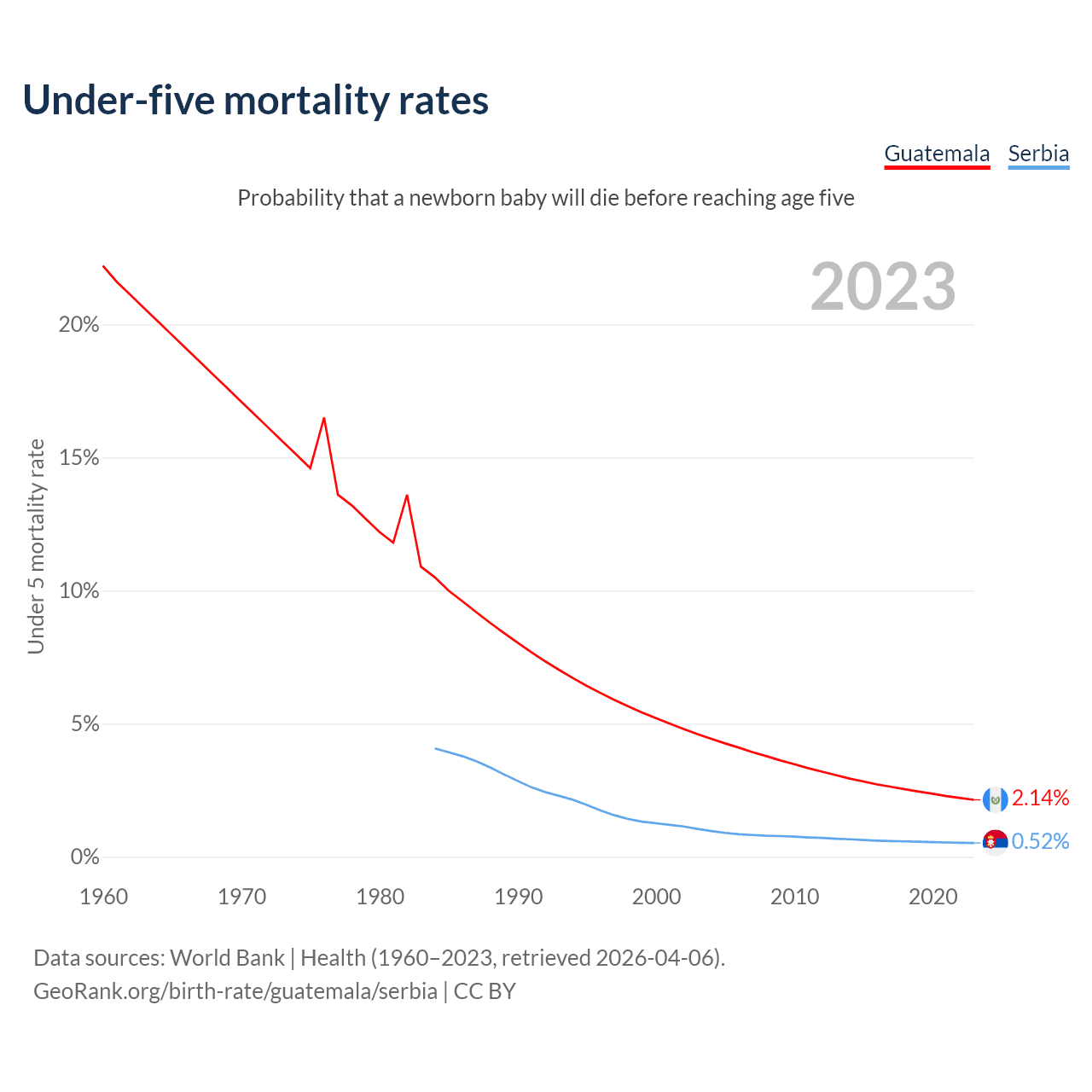 The chance that a newborn baby will die before reaching age five is 2.14% in Guatemala and 0.52% in Serbia. Above is a chart with historical data on under-five mortality rates.