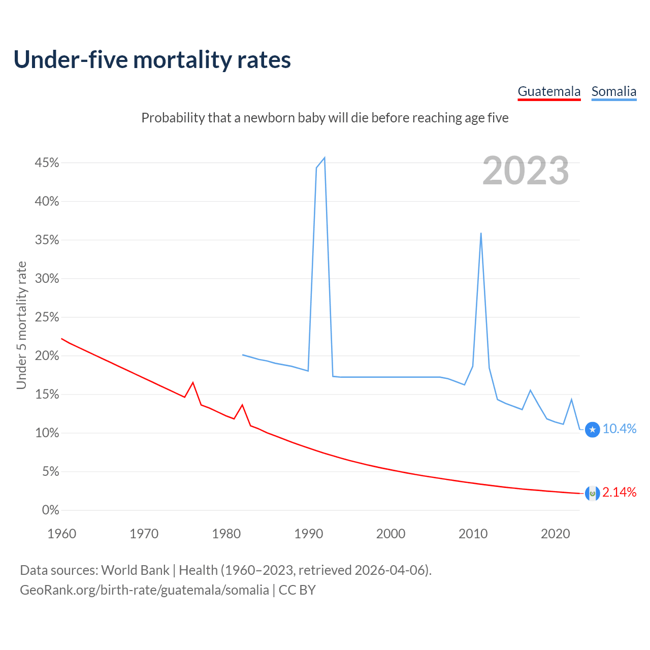 The chance that a newborn baby will die before reaching age five is 2.14% in Guatemala and 10.4% in Somalia. Above is a chart with historical data on under-five mortality rates.