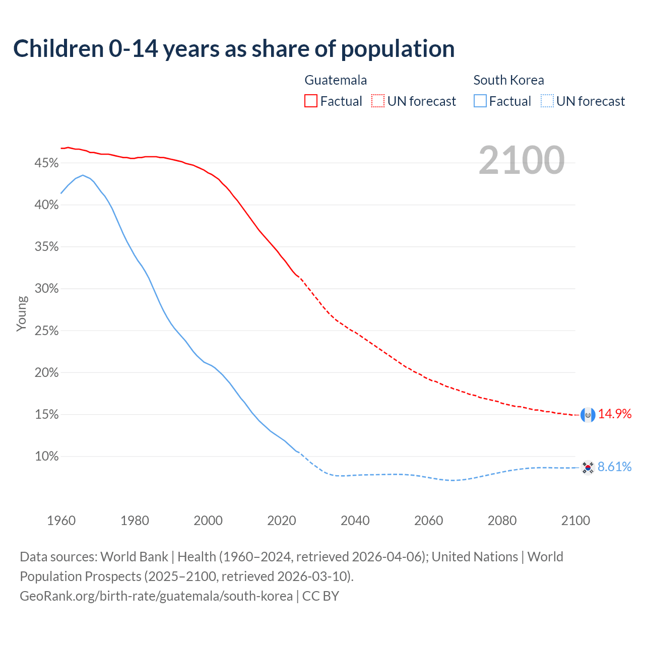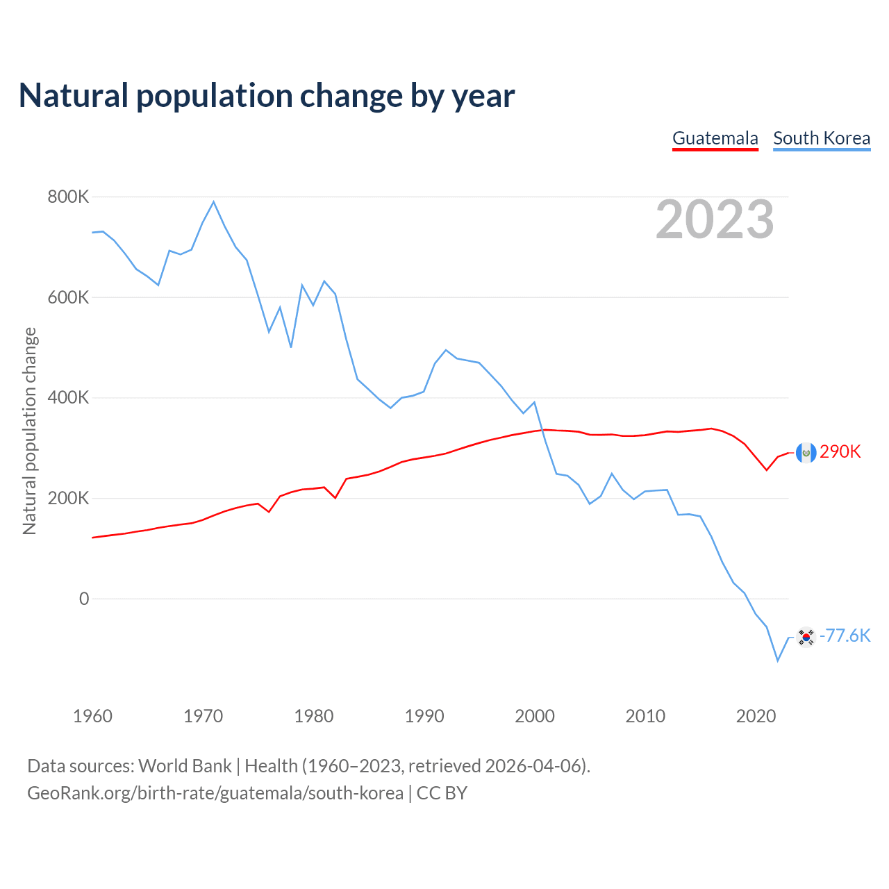 According to the latest available data on birth rates, the fertility rate in Guatemala was 2.31 children per woman in 2023, compared to 0.72 in South Korea in 2023. The replacement level is considered to be 2.1 children per woman.