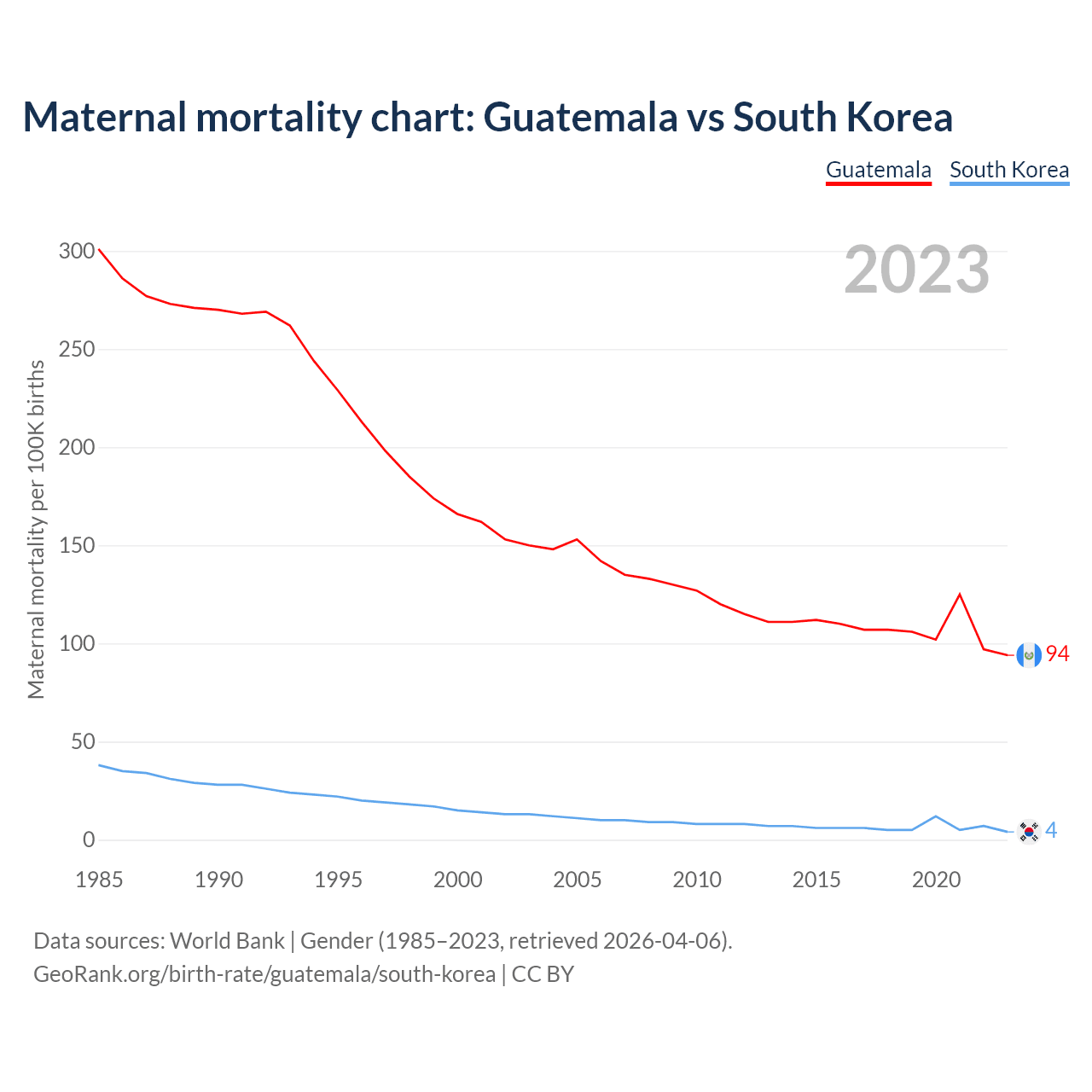 The maternal mortality rate, which is the probability of dying during childbirth or within 42 days of pregnancy termination, is 94 deaths per 100,000 live births in Guatemala, compared to 4 deaths in South Korea.
