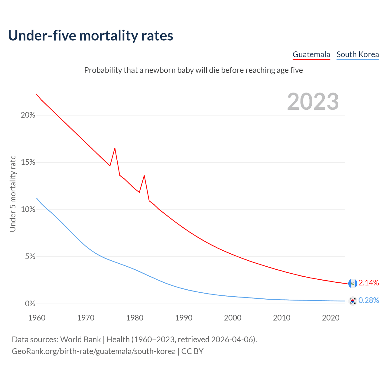 The chance that a newborn baby will die before reaching age five is 2.14% in Guatemala and 0.28% in South Korea. Above is a chart with historical data on under-five mortality rates.