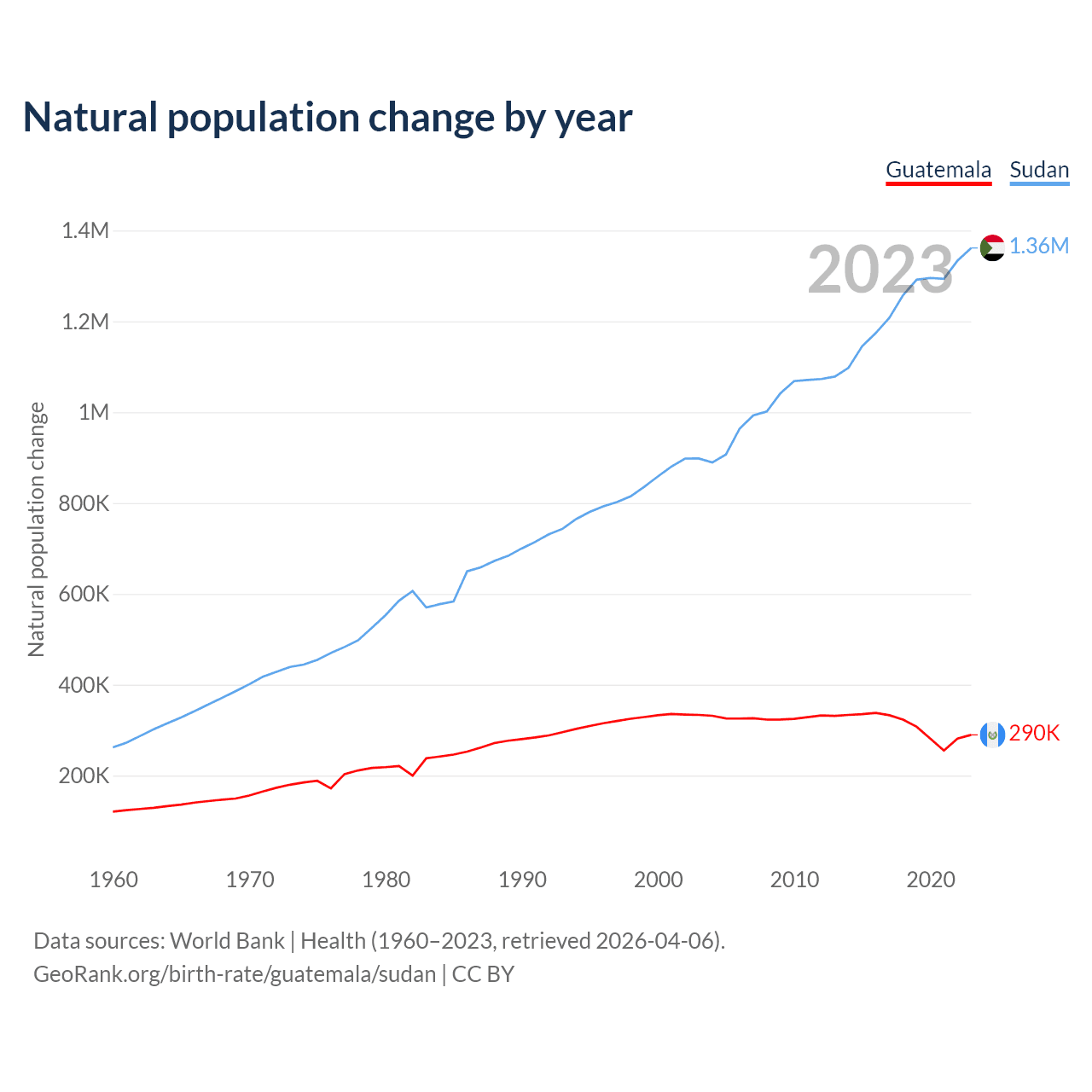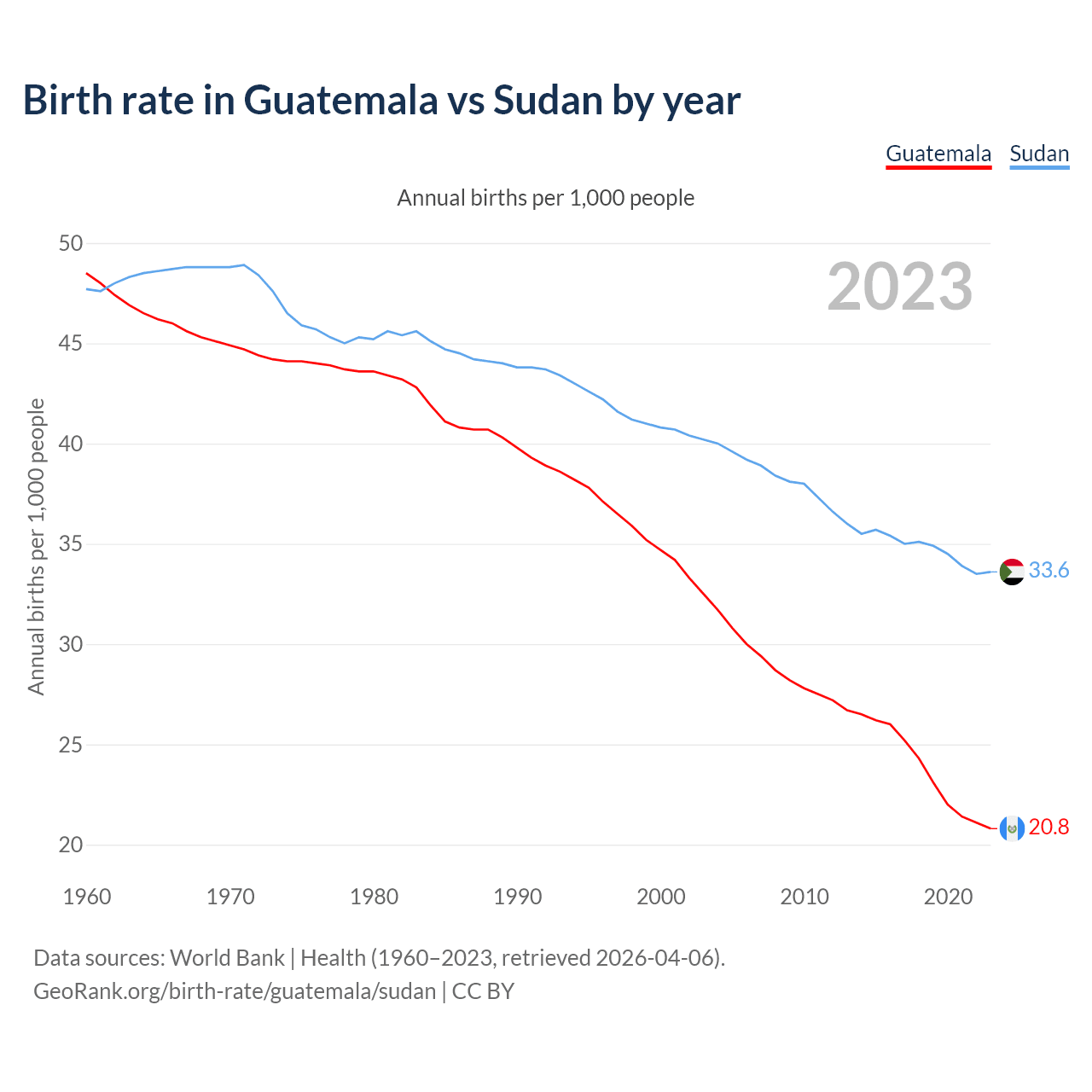 Guatemala has an annual birth rate of 20.8 births per 1,000 people, compared to 33.6 for Sudan. The average number of children a woman is expected to have during her lifetime — the fertility rate, is 2.31 in Guatemala and 4.32 in Sudan — 87.1% difference.