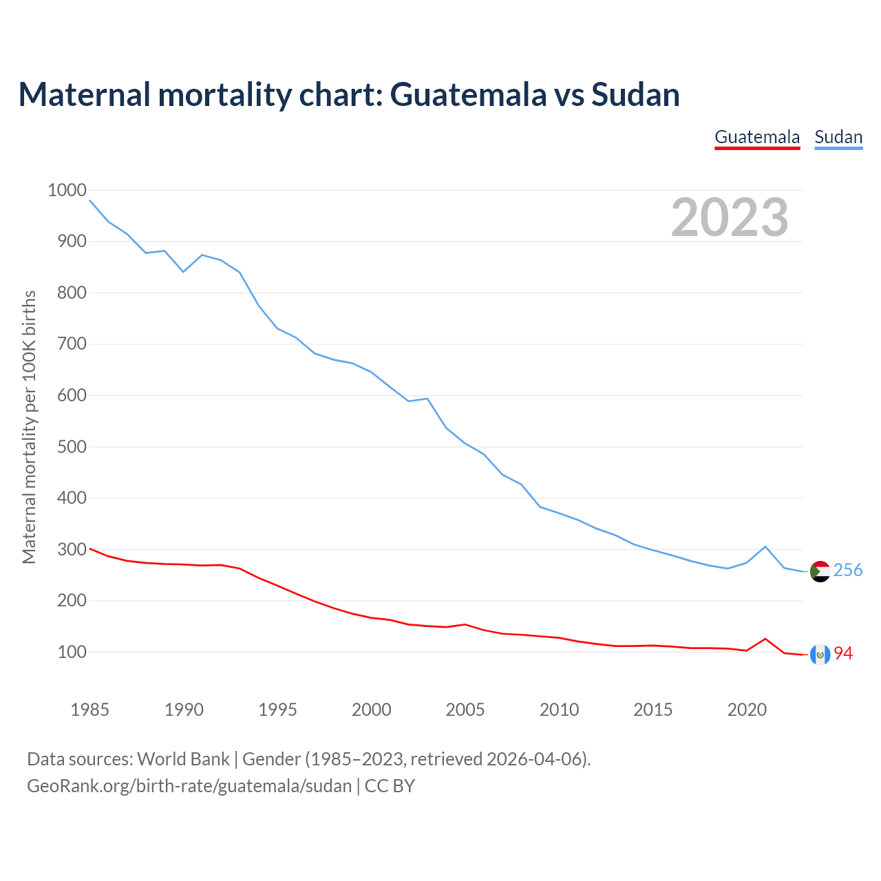 The maternal mortality rate, which is the probability of dying during childbirth or within 42 days of pregnancy termination, is 94 deaths per 100,000 live births in Guatemala, compared to 256 deaths in Sudan.