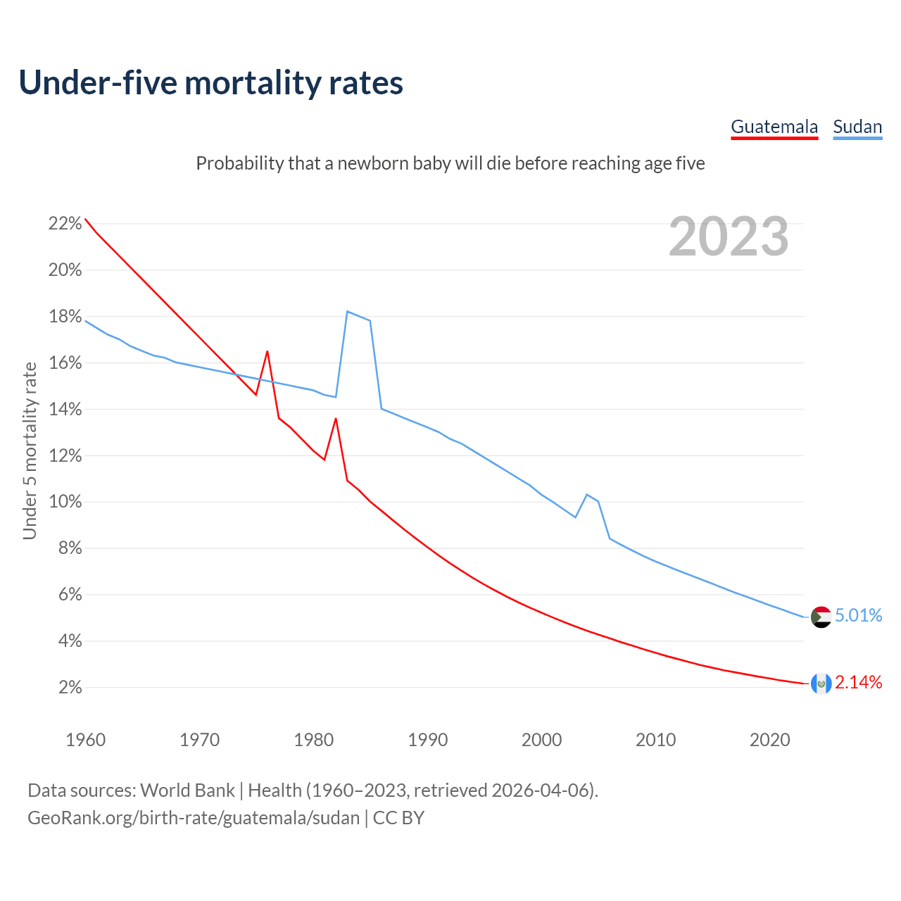 The chance that a newborn baby will die before reaching age five is 2.14% in Guatemala and 5.01% in Sudan. Above is a chart with historical data on under-five mortality rates.