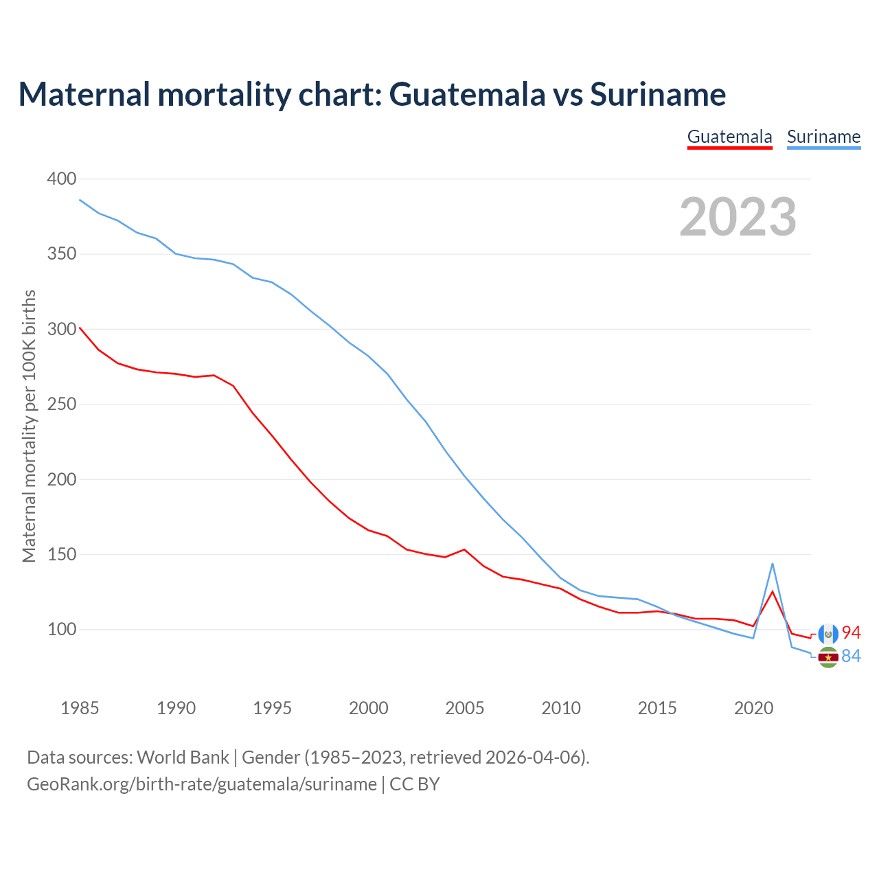 The maternal mortality rate, which is the probability of dying during childbirth or within 42 days of pregnancy termination, is 94 deaths per 100,000 live births in Guatemala, compared to 84 deaths in Suriname.