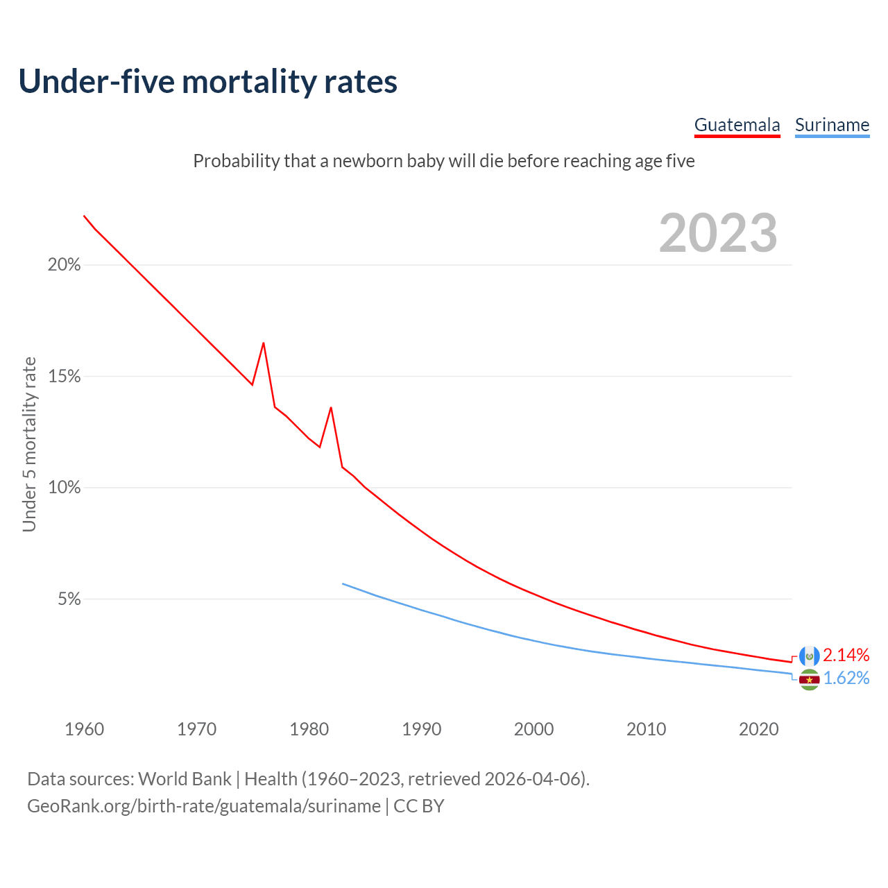 The chance that a newborn baby will die before reaching age five is 2.14% in Guatemala and 1.62% in Suriname. Above is a chart with historical data on under-five mortality rates.