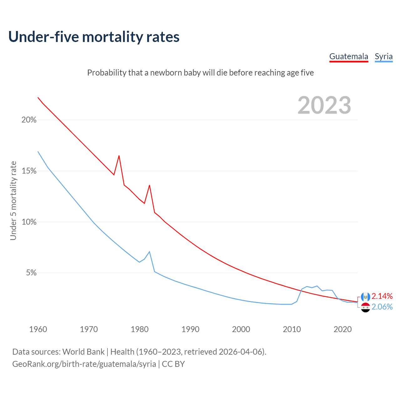 The chance that a newborn baby will die before reaching age five is 2.14% in Guatemala and 2.06% in Syria. Above is a chart with historical data on under-five mortality rates.
