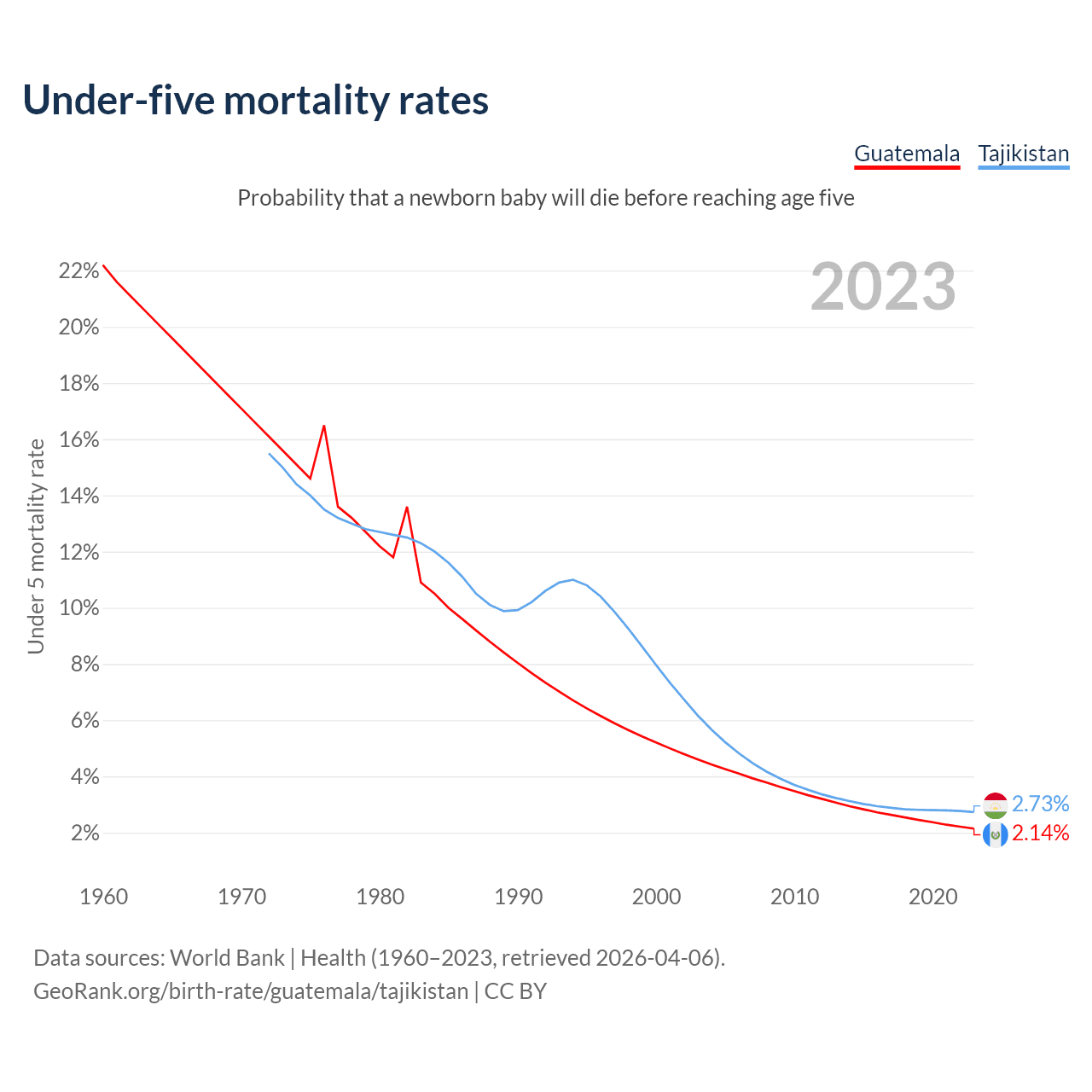 The chance that a newborn baby will die before reaching age five is 2.14% in Guatemala and 2.73% in Tajikistan. Above is a chart with historical data on under-five mortality rates.