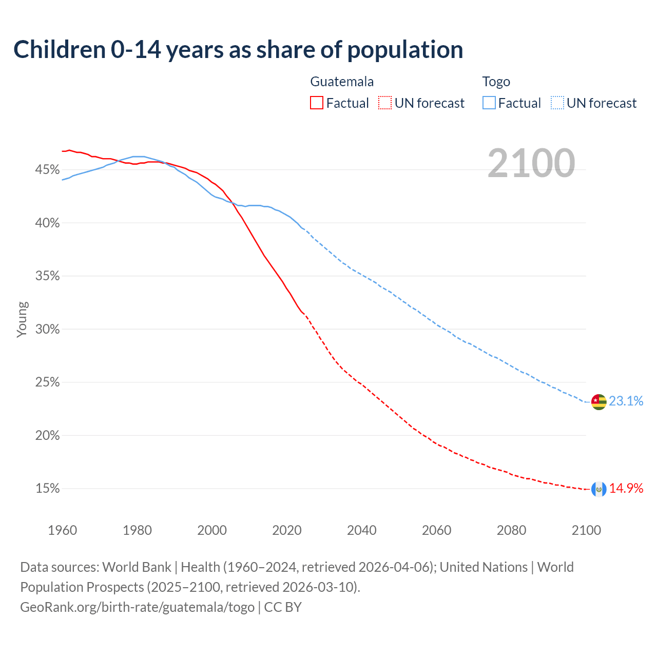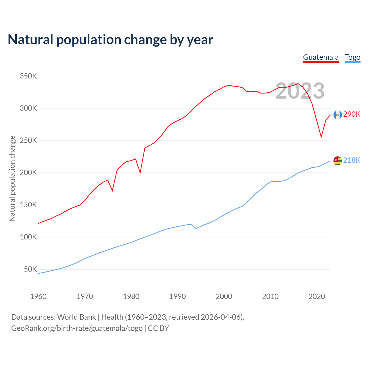 According to the latest available data on birth rates, the fertility rate in Guatemala was 2.31 children per woman in 2023, compared to 4.19 in Togo in 2023. The replacement level is considered to be 2.1 children per woman.