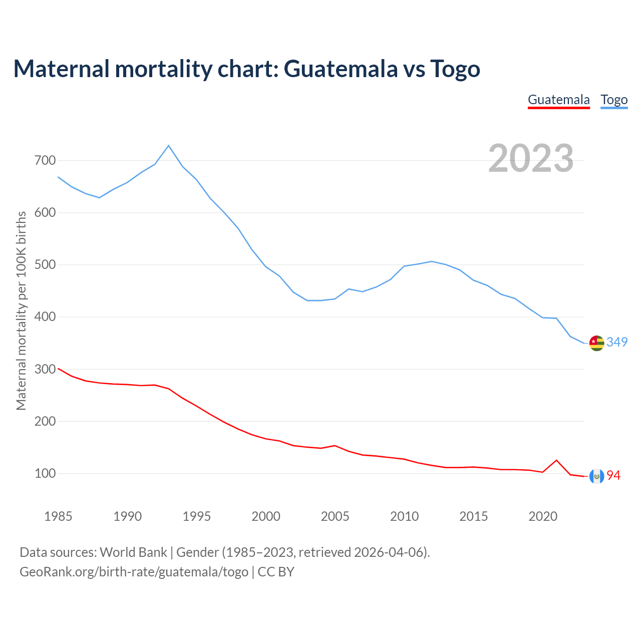 - Annual births per 1,000 women ages 15-19 (adolescent birth rate or teenage mother rate) is 68.3 in Guatemala vs 77.1 in Togo.