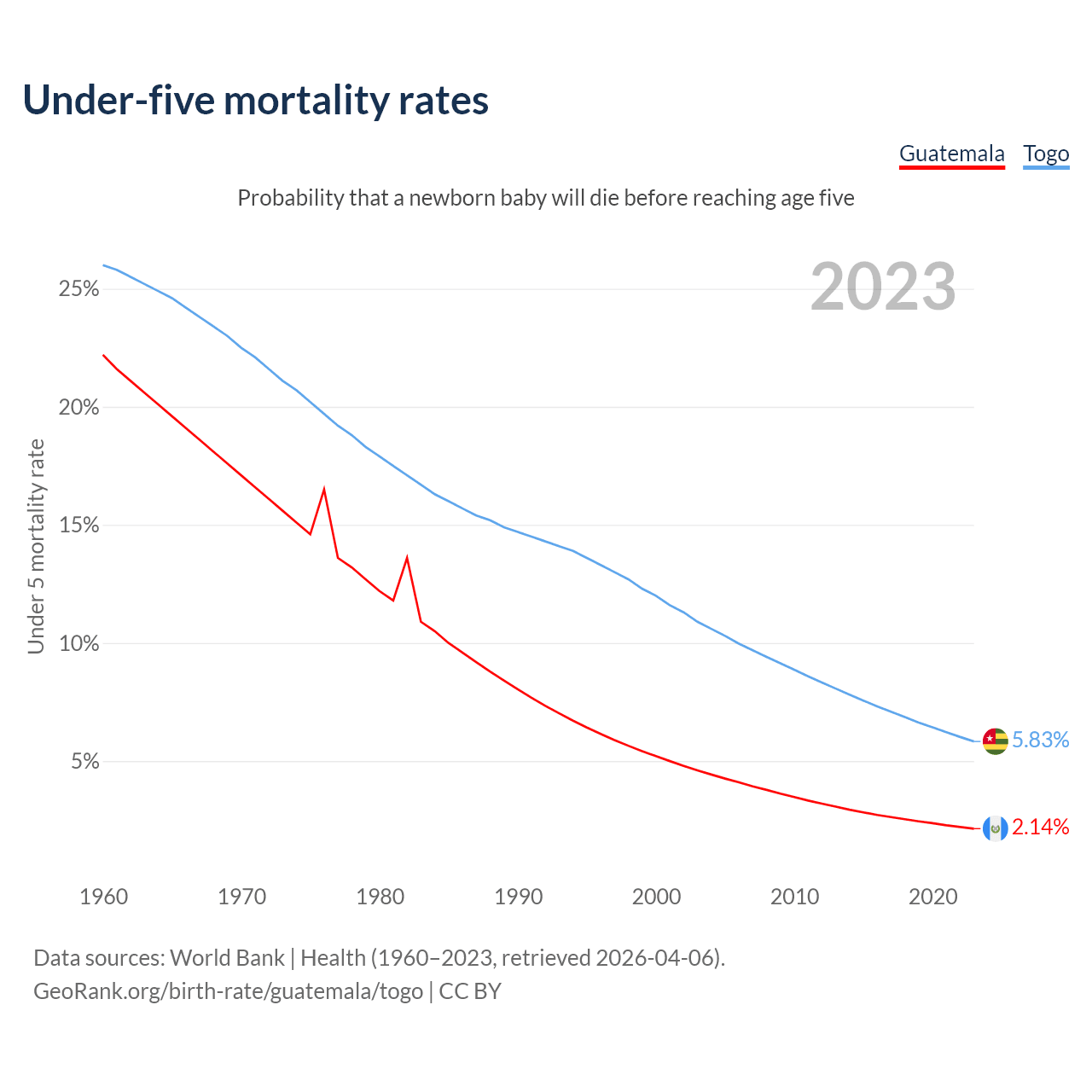 The chance that a newborn baby will die before reaching age five is 2.14% in Guatemala and 5.83% in Togo. Above is a chart with historical data on under-five mortality rates.