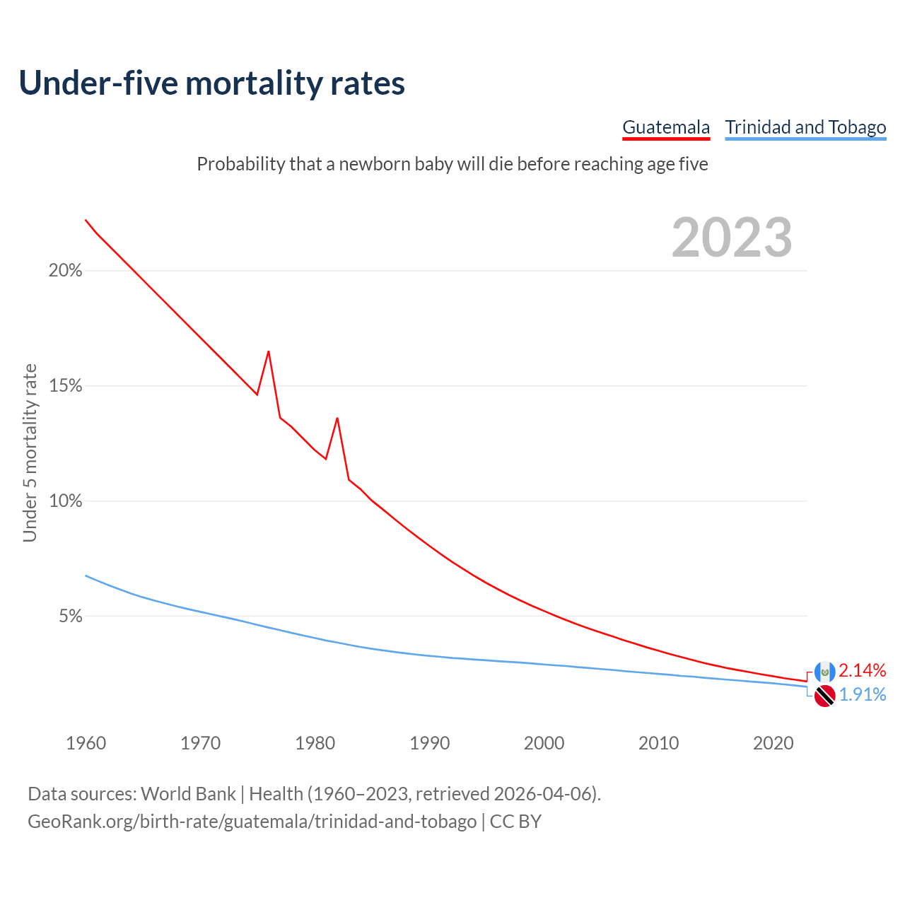 The chance that a newborn baby will die before reaching age five is 2.14% in Guatemala and 1.91% in Trinidad and Tobago. Above is a chart with historical data on under-five mortality rates.