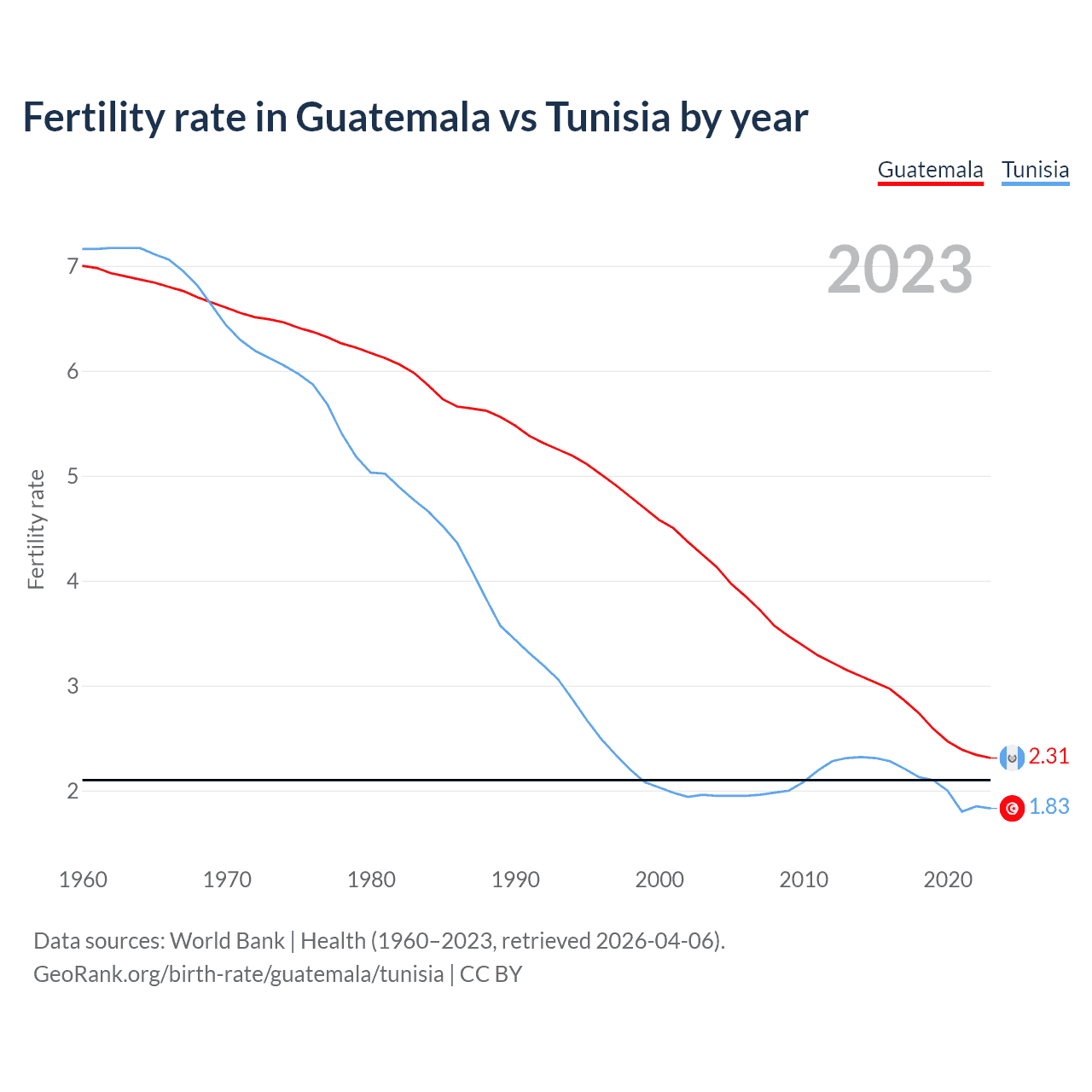 1960 vs 2023, the fertility rate has decreased by 67% in Guatemala and by 74.4% in Tunisia — in 1960, it was 7 and 7.16, respectively.