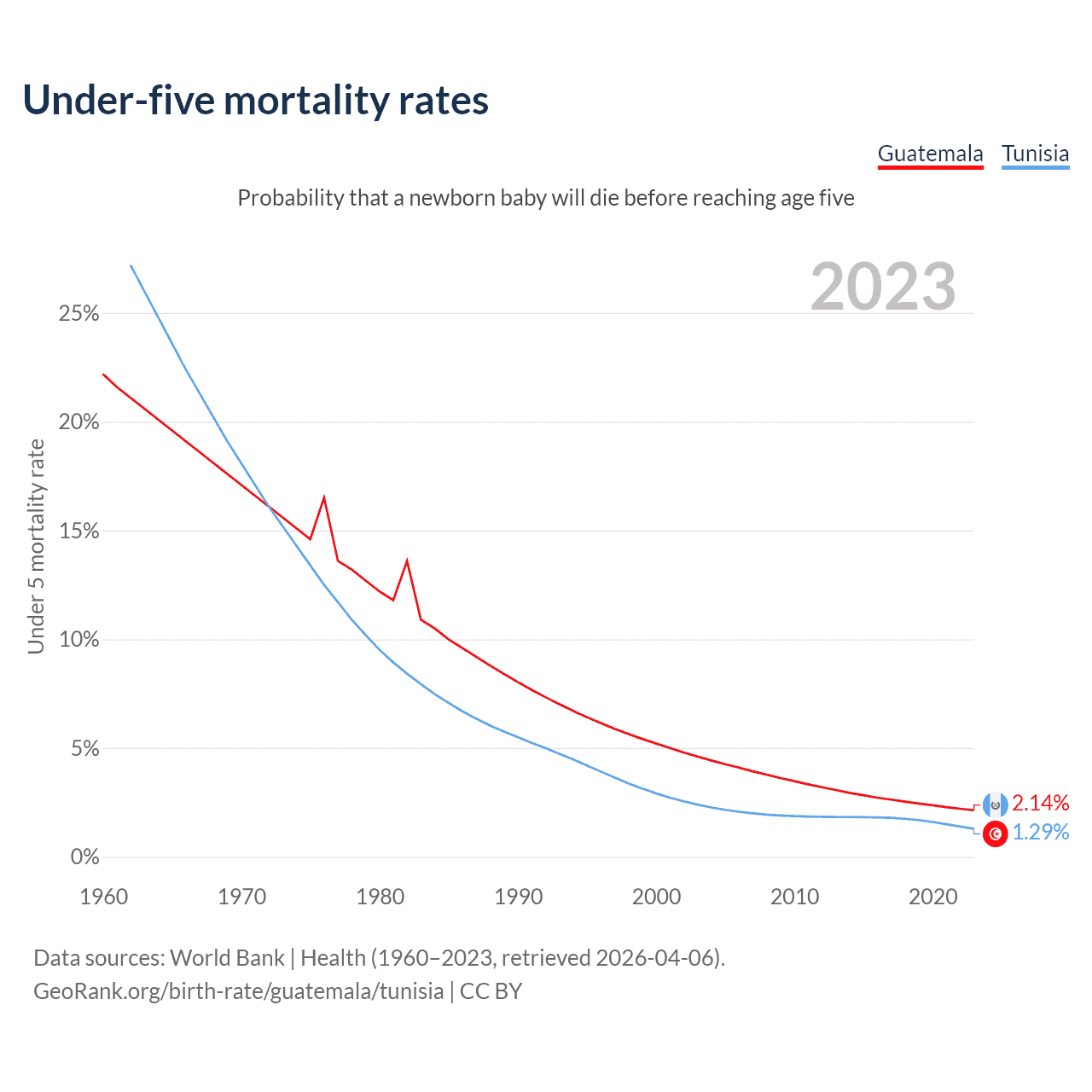 The chance that a newborn baby will die before reaching age five is 2.14% in Guatemala and 1.29% in Tunisia. Above is a chart with historical data on under-five mortality rates.