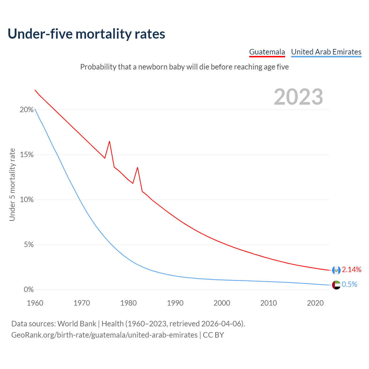 The chance that a newborn baby will die before reaching age five is 2.14% in Guatemala and 0.5% in the United Arab Emirates. Above is a chart with historical data on under-five mortality rates.