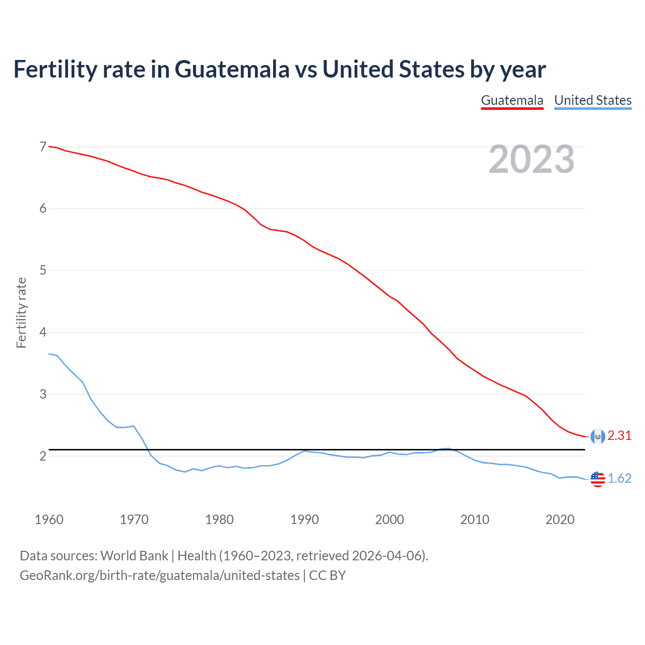 1960 vs 2023, the fertility rate has decreased by 67% in Guatemala and by 55.8% in the United States — in 1960, it was 7 and 3.65, respectively.