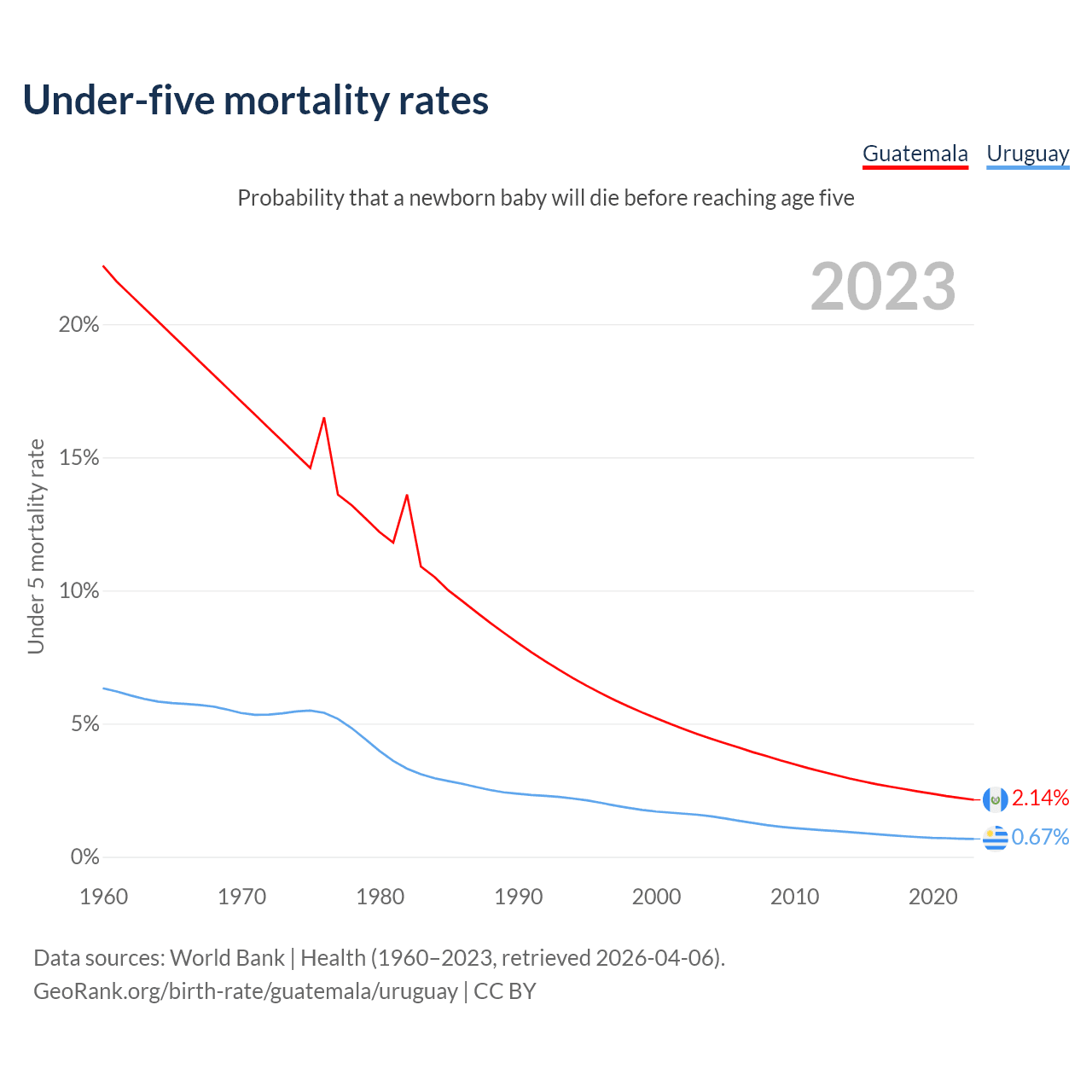 The chance that a newborn baby will die before reaching age five is 2.14% in Guatemala and 0.67% in Uruguay. Above is a chart with historical data on under-five mortality rates.