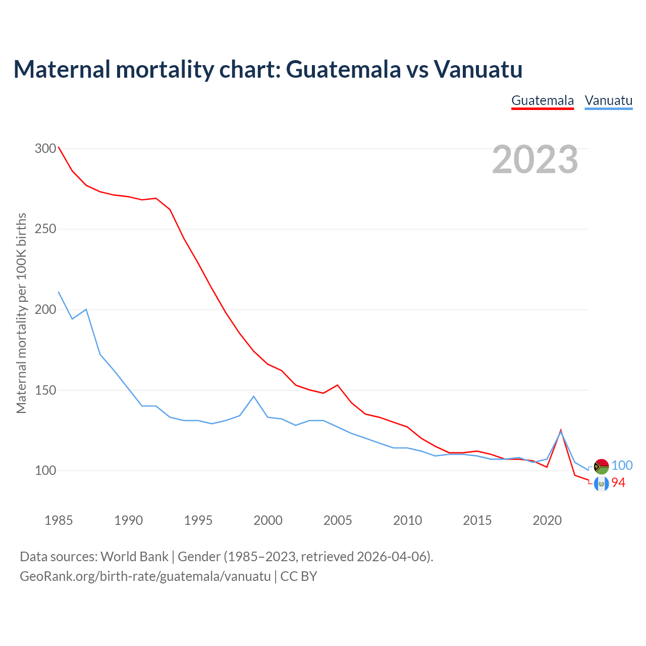 The maternal mortality rate, which is the probability of dying during childbirth or within 42 days of pregnancy termination, is 94 deaths per 100,000 live births in Guatemala, compared to 100 deaths in Vanuatu.
