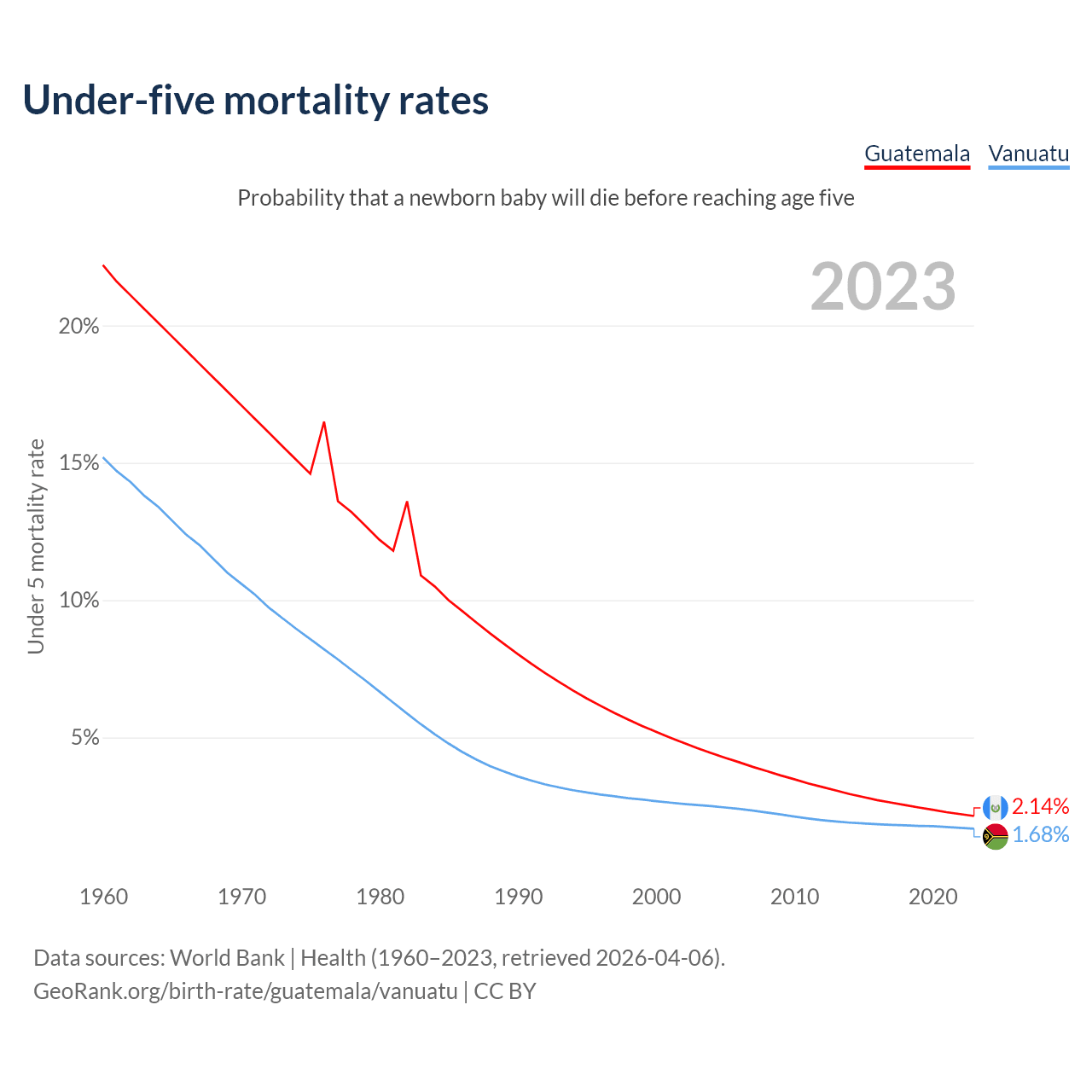 The chance that a newborn baby will die before reaching age five is 2.14% in Guatemala and 1.68% in Vanuatu. Above is a chart with historical data on under-five mortality rates.