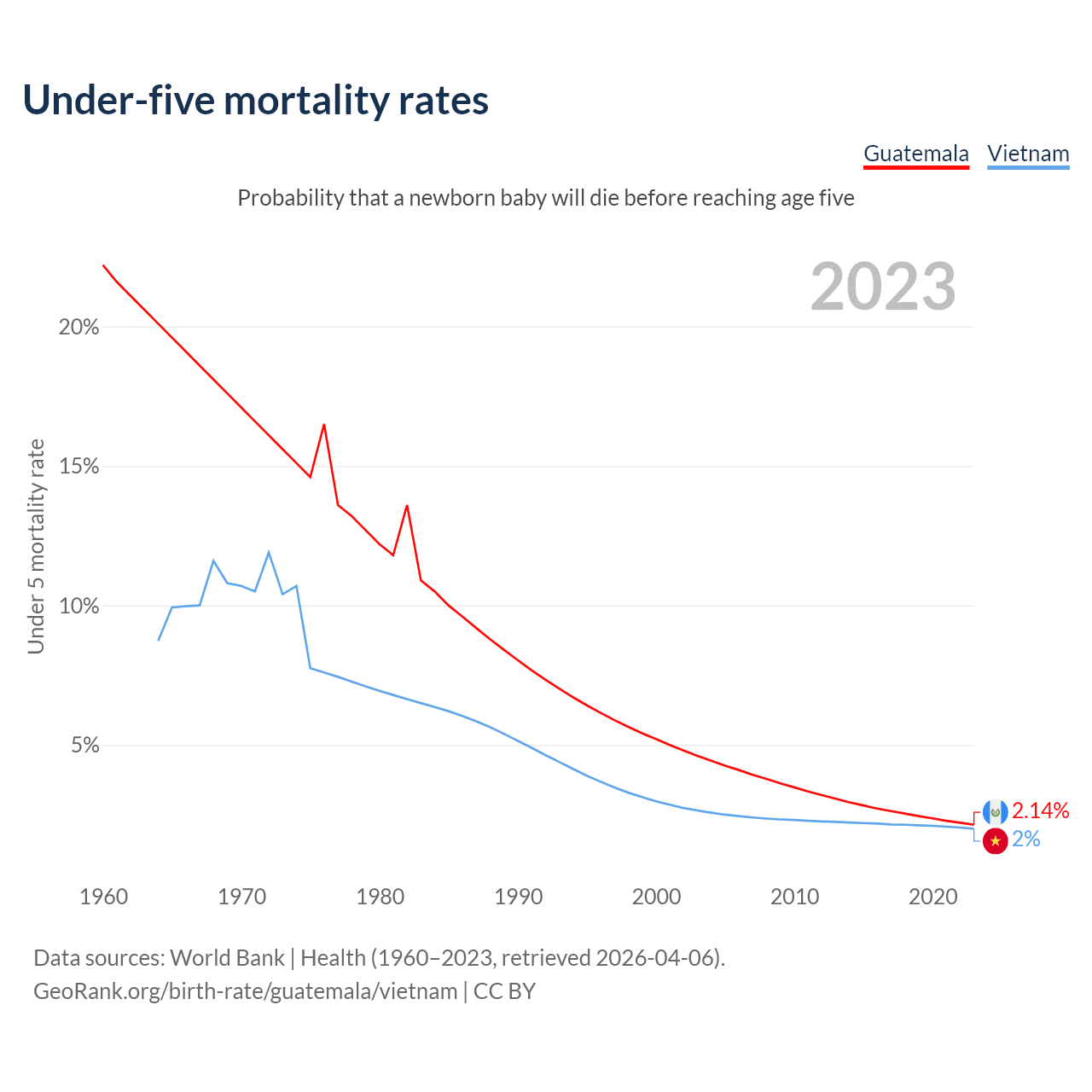 The chance that a newborn baby will die before reaching age five is 2.14% in Guatemala and 2% in Vietnam. Above is a chart with historical data on under-five mortality rates.