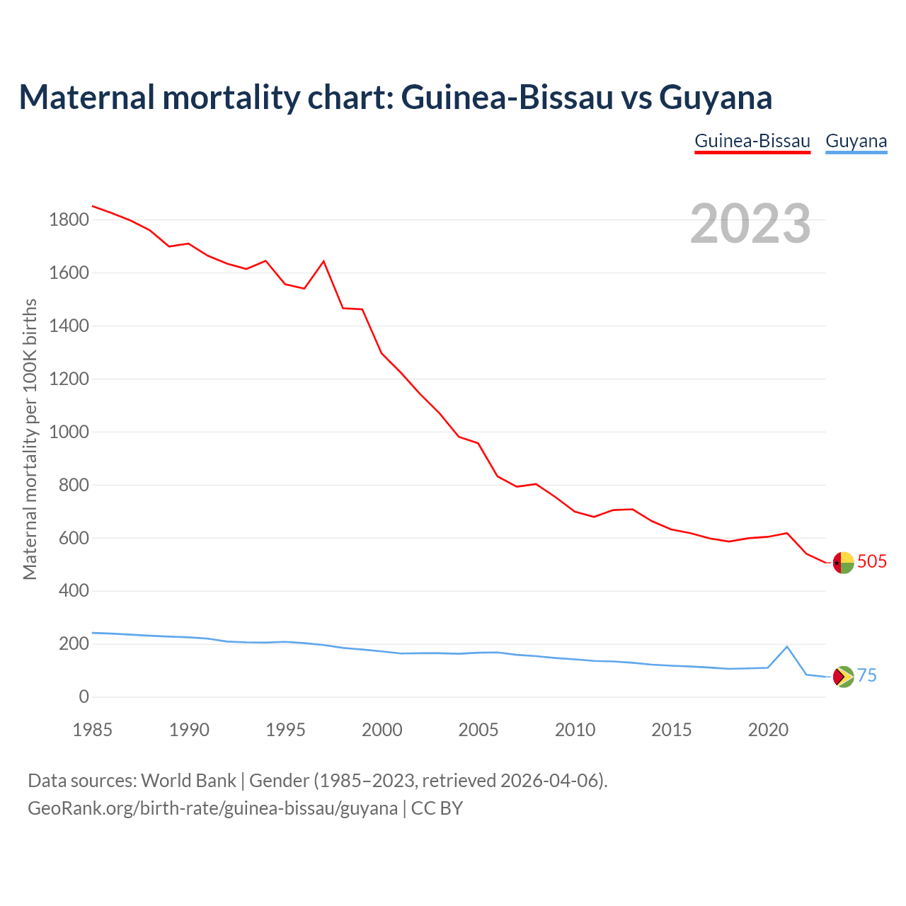 The maternal mortality rate, which is the probability of dying during childbirth or within 42 days of pregnancy termination, is 505 deaths per 100,000 live births in Guinea-Bissau, compared to 75 deaths in Guyana.