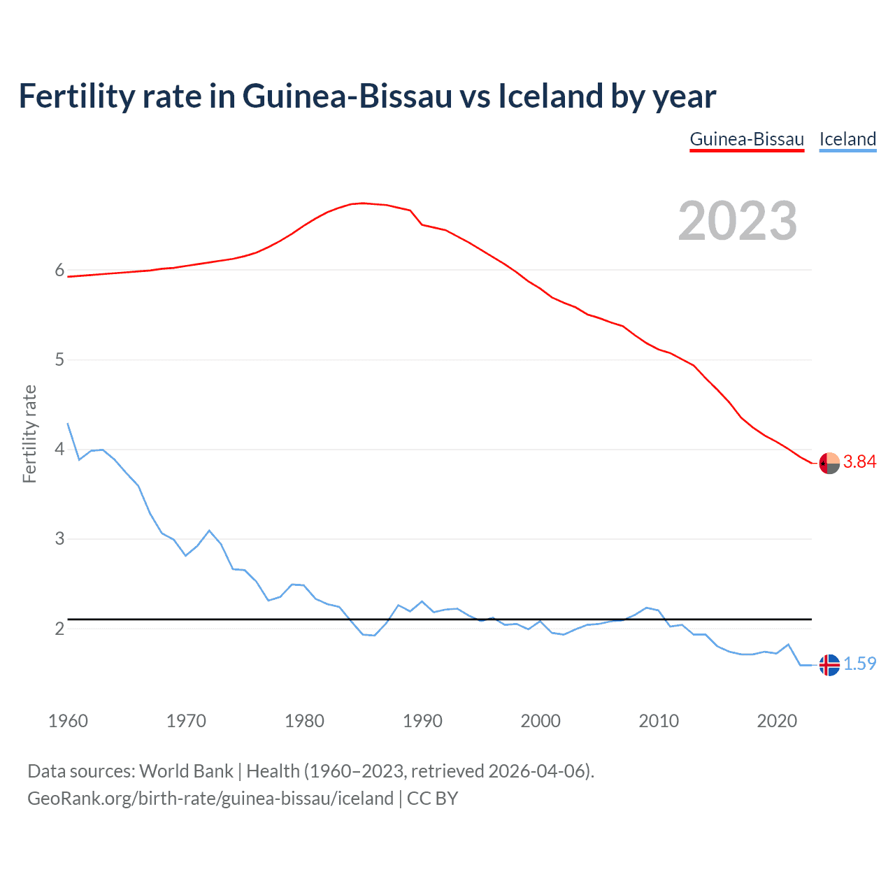 According to the latest available data on birth rates, the fertility rate in Guinea-Bissau was 3.84 children per woman in 2023, compared to 1.59 in Iceland in 2023. The replacement level is considered to be 2.1 children per woman.
