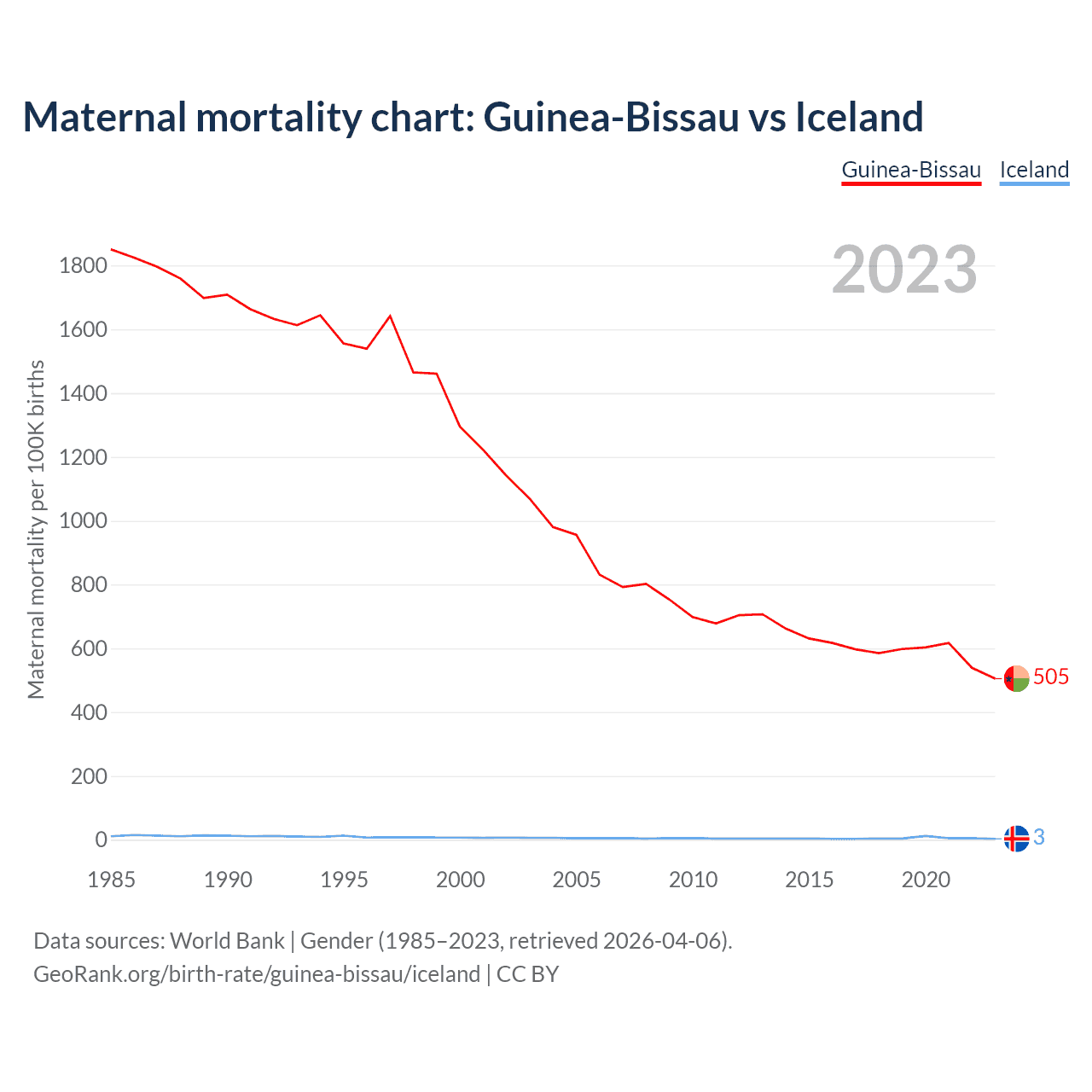 The maternal mortality rate, which is the probability of dying during childbirth or within 42 days of pregnancy termination, is 505 deaths per 100,000 live births in Guinea-Bissau, compared to 3 deaths in Iceland.