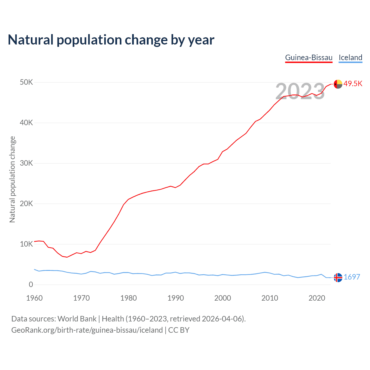 Guinea-Bissau has an annual birth rate of 30 births per 1,000 people, compared to 11 for Iceland. The average number of children a woman is expected to have during her lifetime — the fertility rate, is 3.84 in Guinea-Bissau and 1.59 in Iceland — 58.6% difference.
