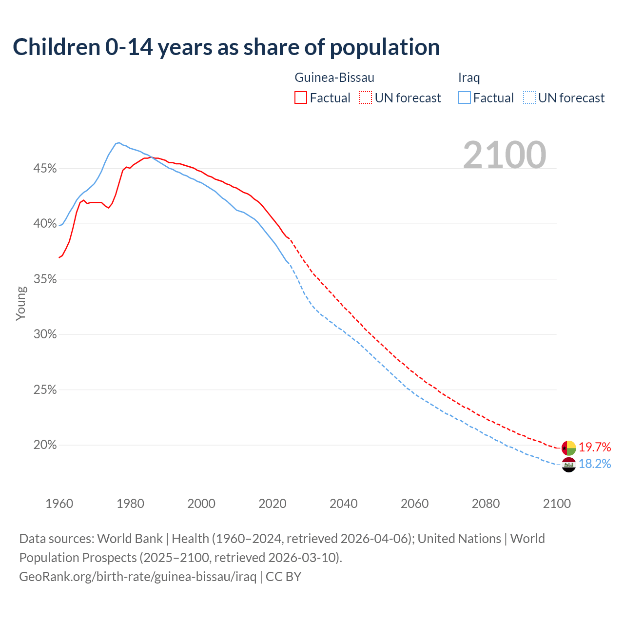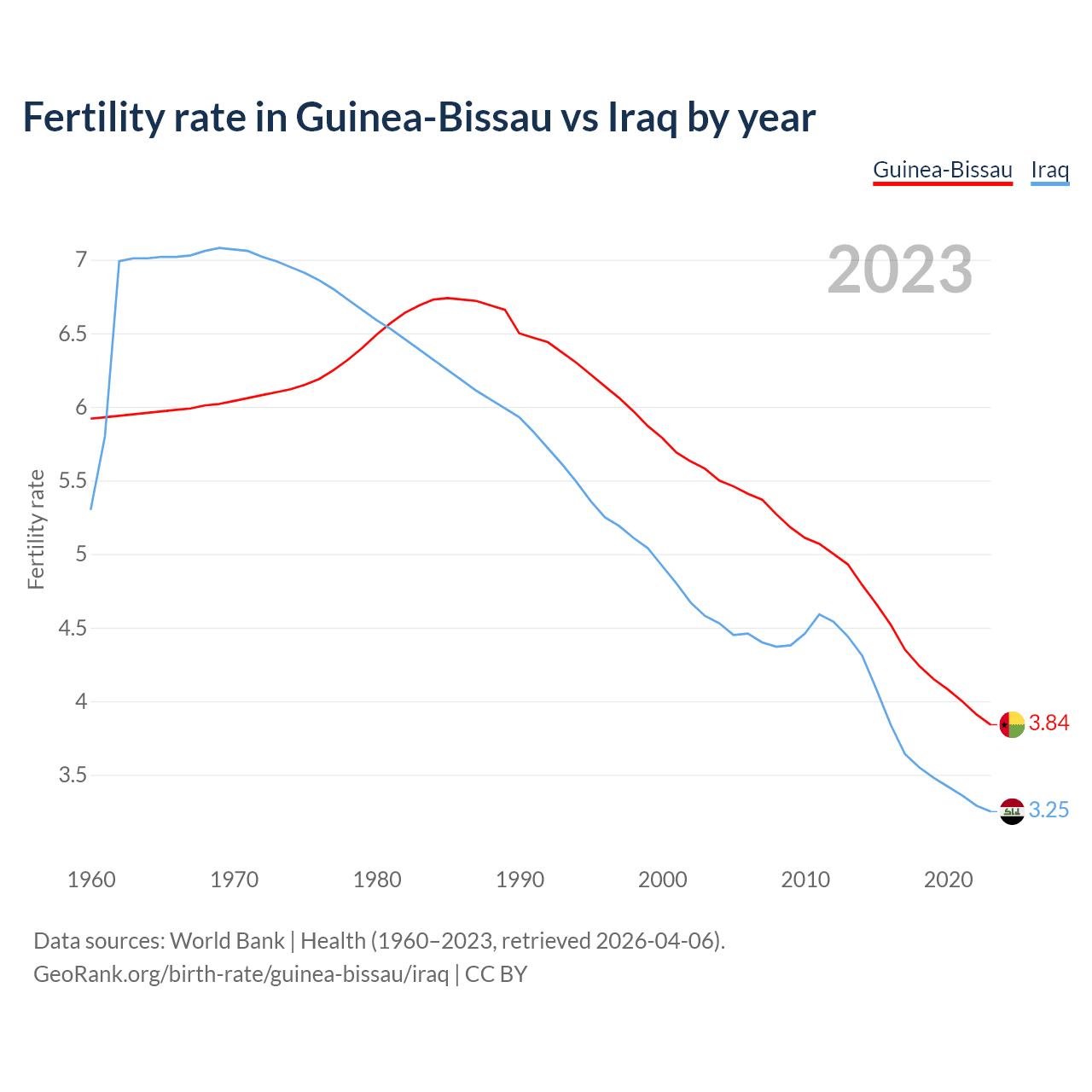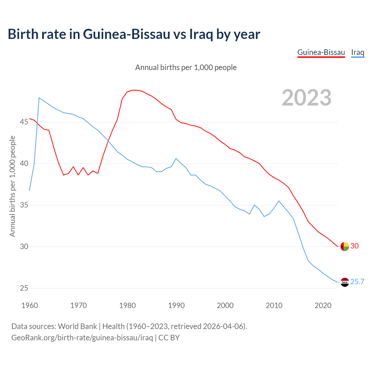 Guinea-Bissau has an annual birth rate of 30 births per 1,000 people, compared to 25.7 for Iraq. The average number of children a woman is expected to have during her lifetime — the fertility rate, is 3.84 in Guinea-Bissau and 3.25 in Iraq — 15.3% difference.
