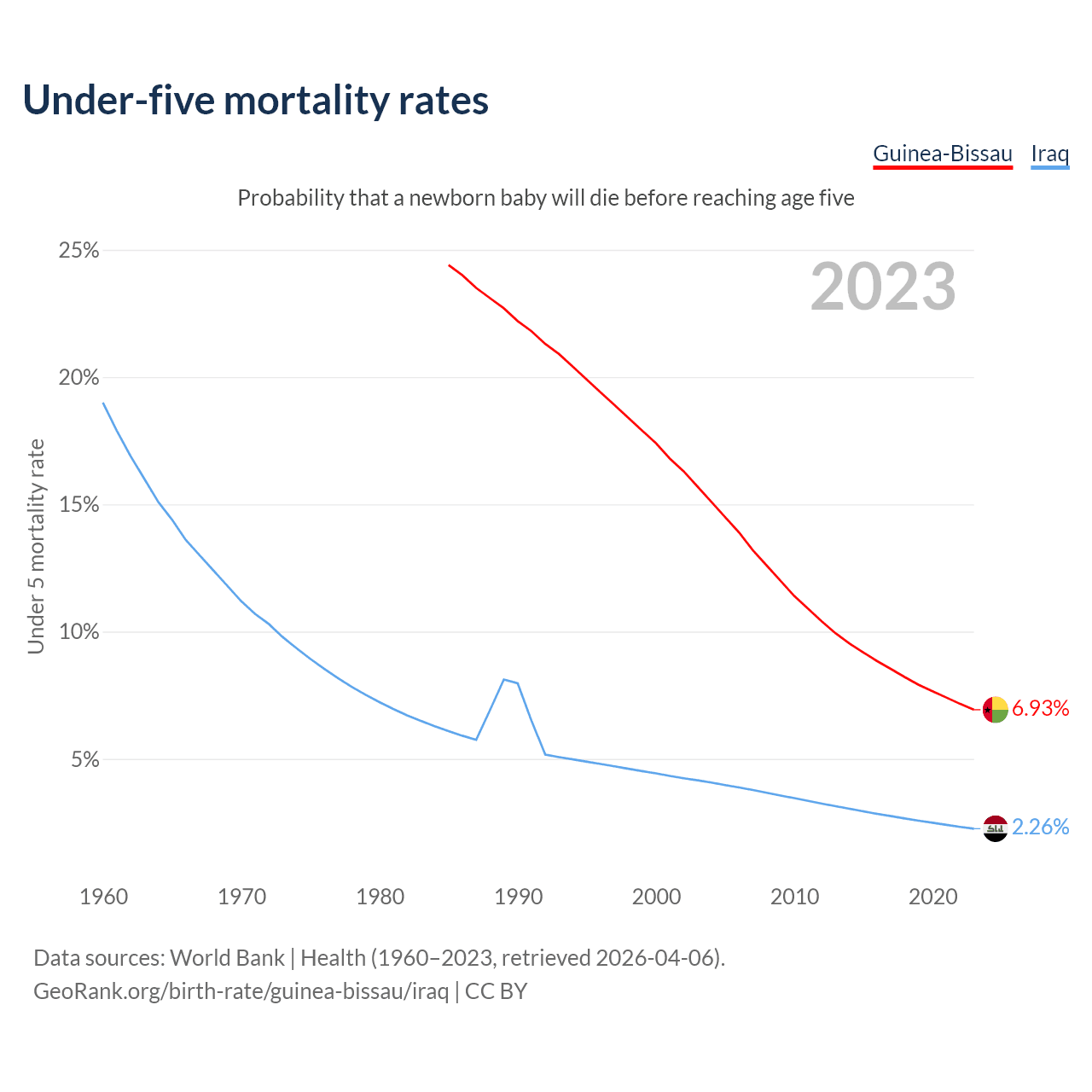 The chance that a newborn baby will die before reaching age five is 6.93% in Guinea-Bissau and 2.26% in Iraq. Above is a chart with historical data on under-five mortality rates.