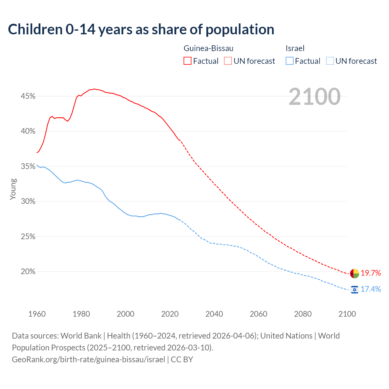 According to the latest available data on birth rates, the fertility rate in Guinea-Bissau was 3.84 children per woman in 2023, compared to 2.85 in Israel in 2023. The replacement level is considered to be 2.1 children per woman.