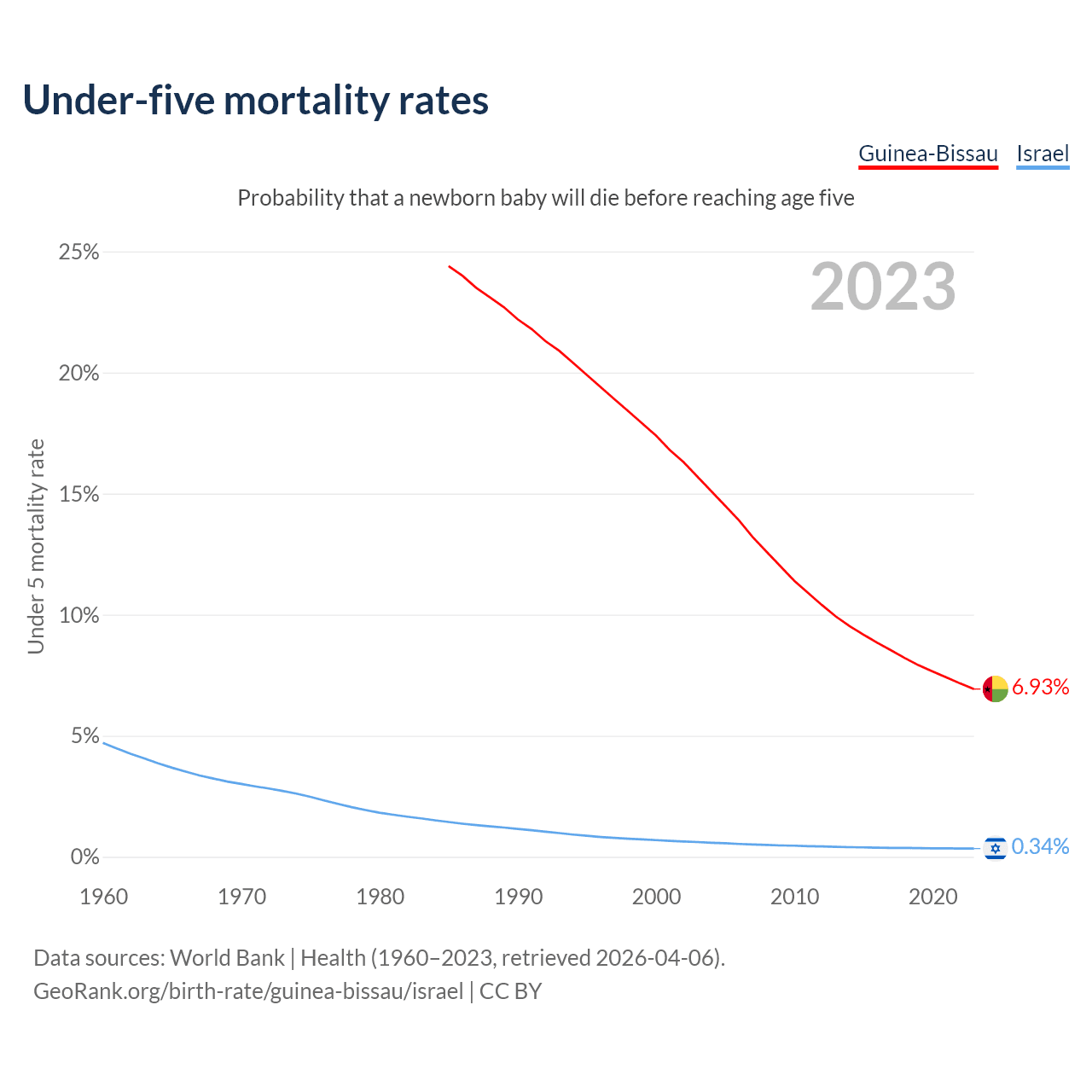 The chance that a newborn baby will die before reaching age five is 6.93% in Guinea-Bissau and 0.34% in Israel. Above is a chart with historical data on under-five mortality rates.