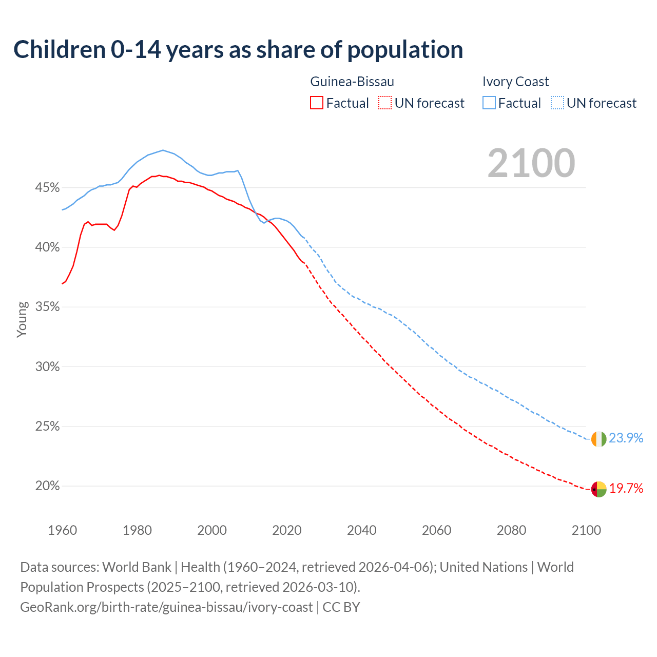 According to the latest available data on birth rates, the fertility rate in Guinea-Bissau was 3.84 children per woman in 2023, compared to 4.28 in Ivory Coast in 2023. The replacement level is considered to be 2.1 children per woman.