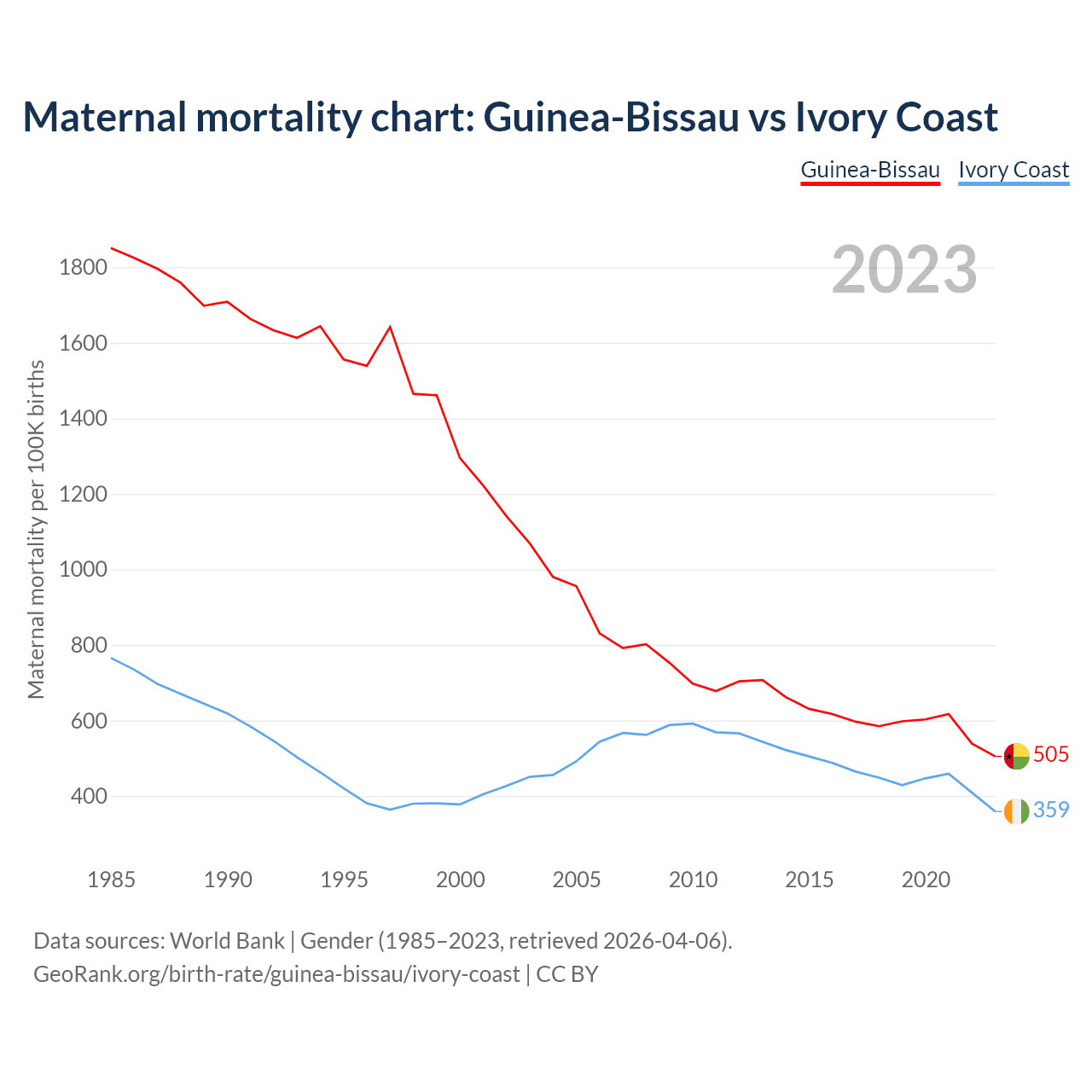 The maternal mortality rate, which is the probability of dying during childbirth or within 42 days of pregnancy termination, is 505 deaths per 100,000 live births in Guinea-Bissau, compared to 359 deaths in Ivory Coast.