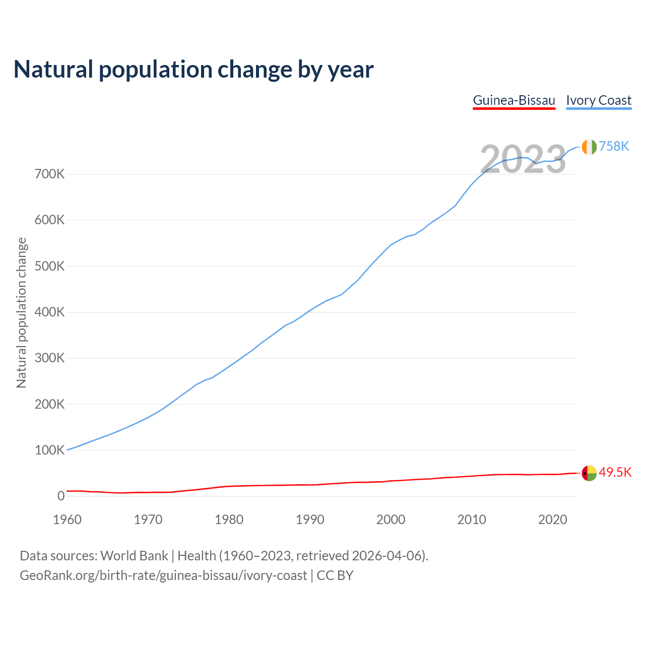 Check Guinea-Bissau vs Ivory Coast population clock for a dynamic visualization of the changing population.