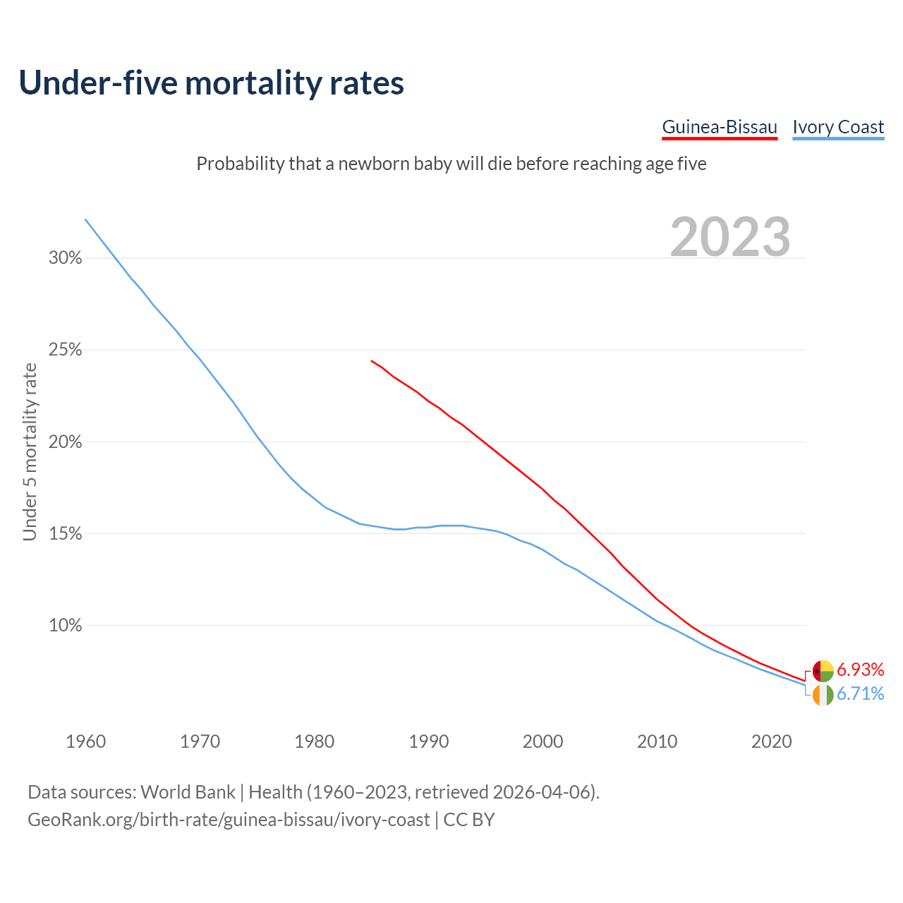 The chance that a newborn baby will die before reaching age five is 6.93% in Guinea-Bissau and 6.71% in Ivory Coast. Above is a chart with historical data on under-five mortality rates.