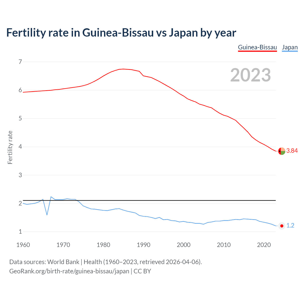 1960 vs 2023, the fertility rate has decreased by 35.2% in Guinea-Bissau and by 40% in Japan — in 1960, it was 5.92 and 2, respectively.