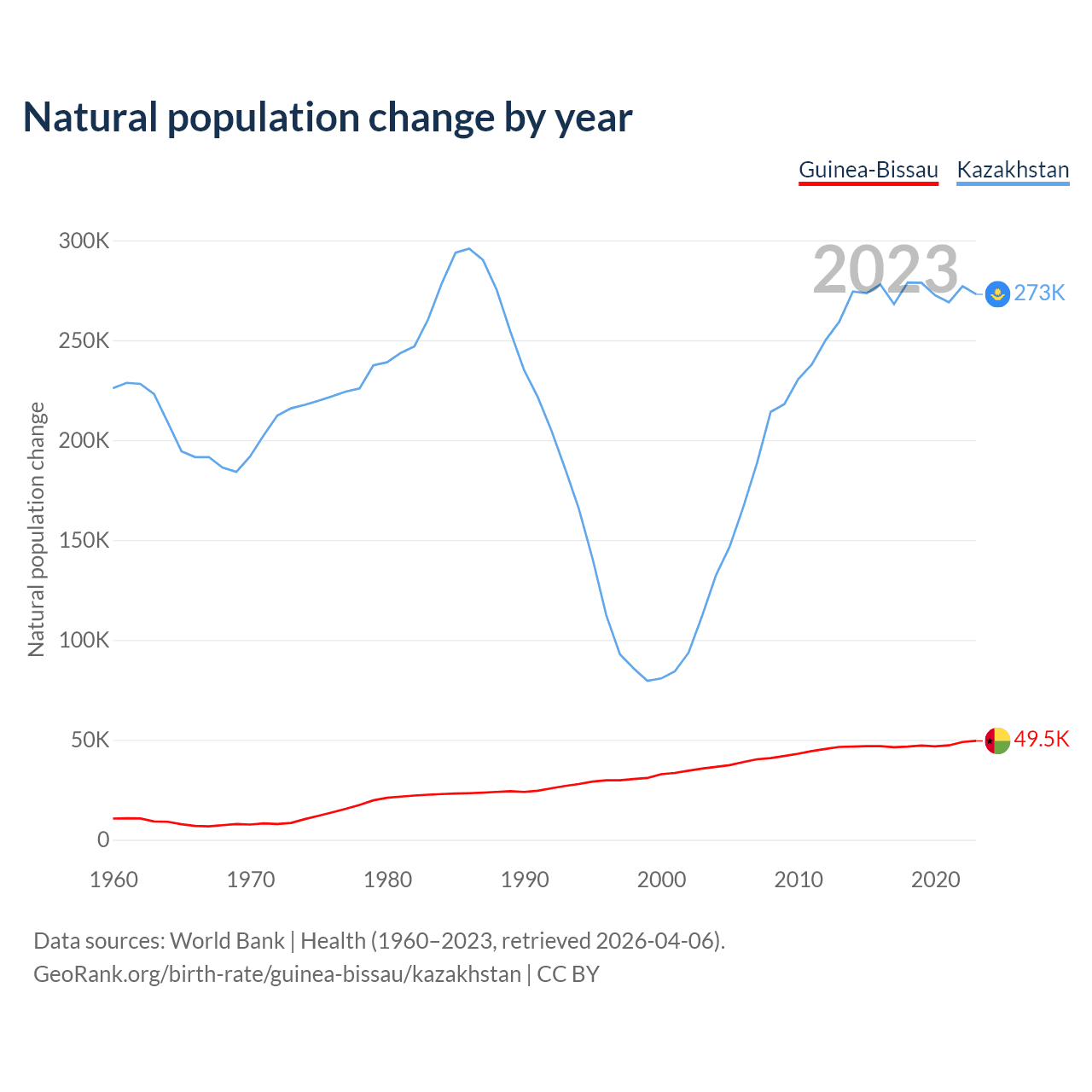 1960 vs 2023, the fertility rate has decreased by 35.2% in Guinea-Bissau and by 33% in Kazakhstan — in 1960, it was 5.92 and 4.5, respectively.