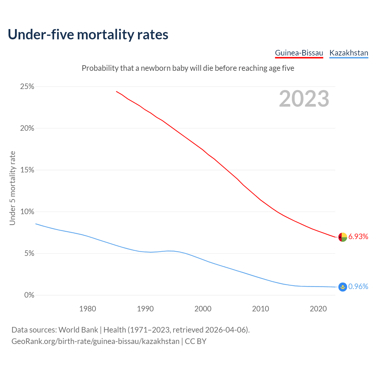 The chance that a newborn baby will die before reaching age five is 6.93% in Guinea-Bissau and 0.96% in Kazakhstan. Above is a chart with historical data on under-five mortality rates.