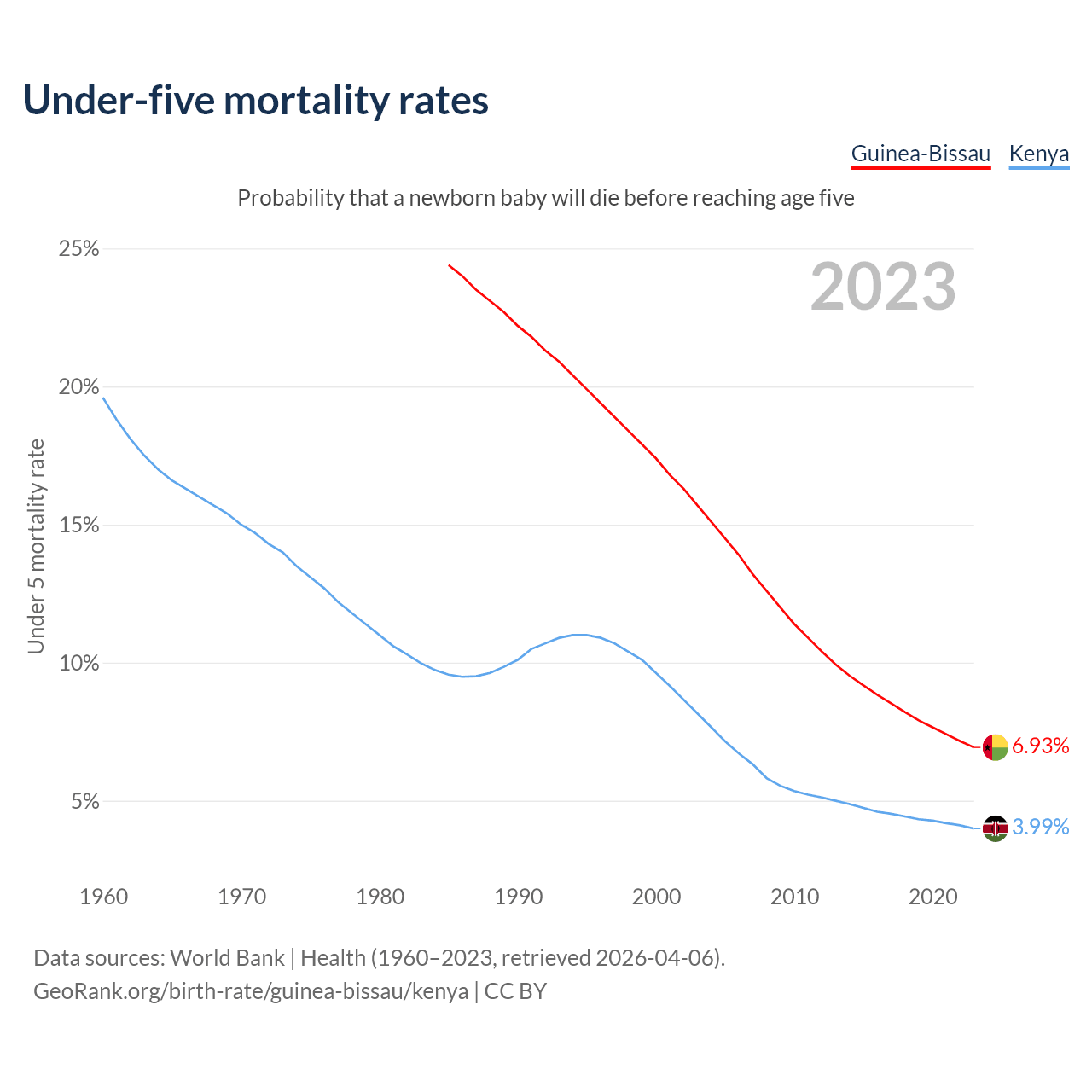 The chance that a newborn baby will die before reaching age five is 6.93% in Guinea-Bissau and 3.99% in Kenya. Above is a chart with historical data on under-five mortality rates.
