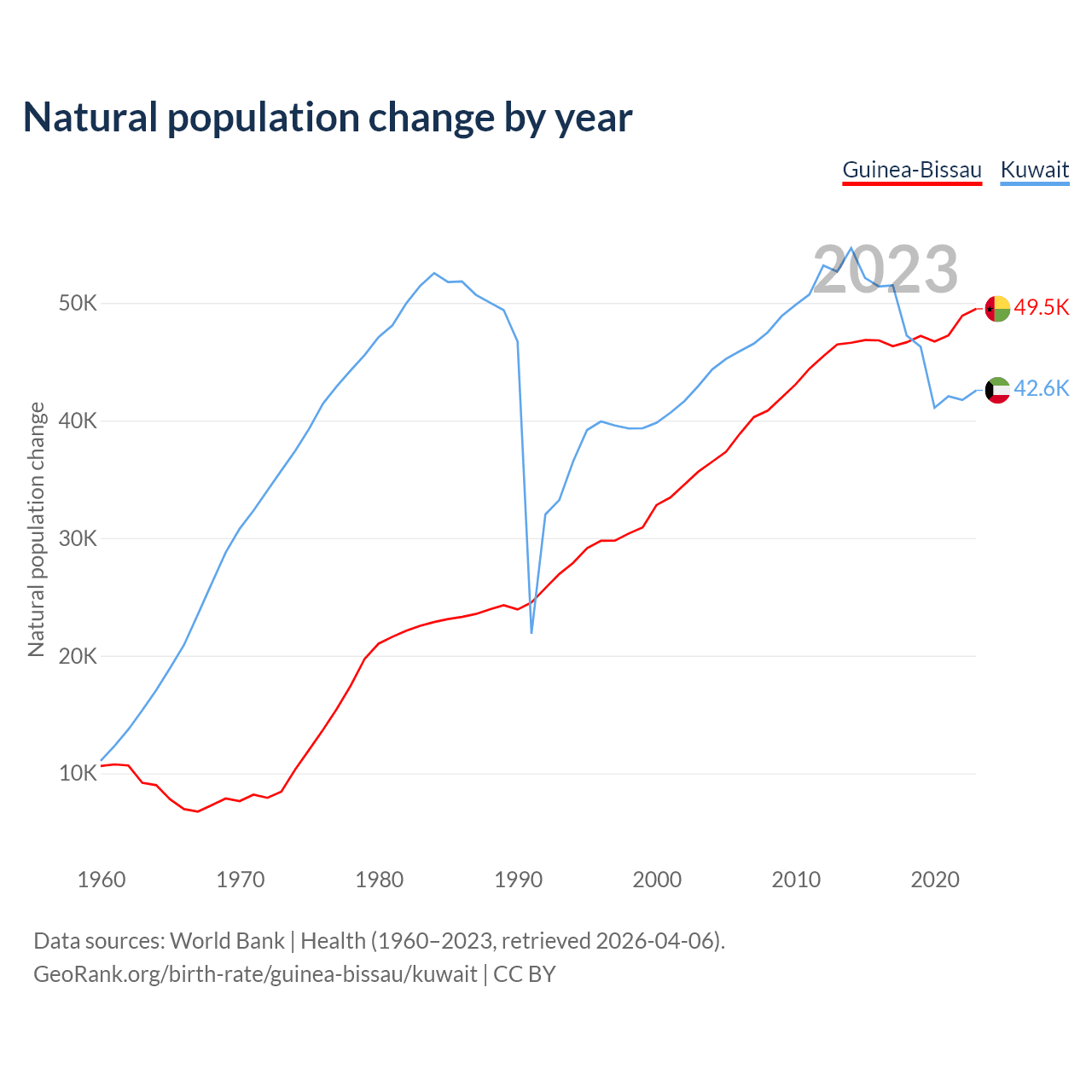 Guinea-Bissau has an annual birth rate of 30 births per 1,000 people, compared to 10.3 for Kuwait. The average number of children a woman is expected to have during her lifetime — the fertility rate, is 3.84 in Guinea-Bissau and 1.52 in Kuwait — 60.3% difference.