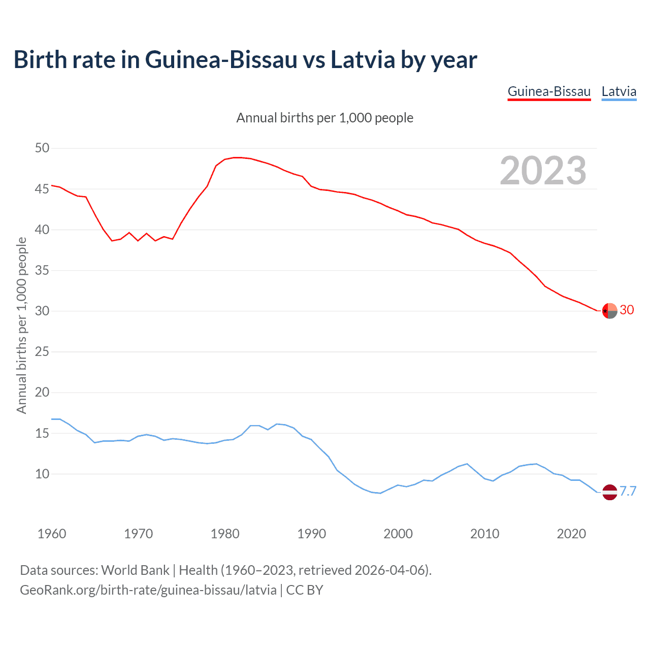 Guinea-Bissau has an annual birth rate of 30 births per 1,000 people, compared to 7.7 for Latvia. The average number of children a woman is expected to have during her lifetime — the fertility rate, is 3.84 in Guinea-Bissau and 1.36 in Latvia — 64.5% difference.