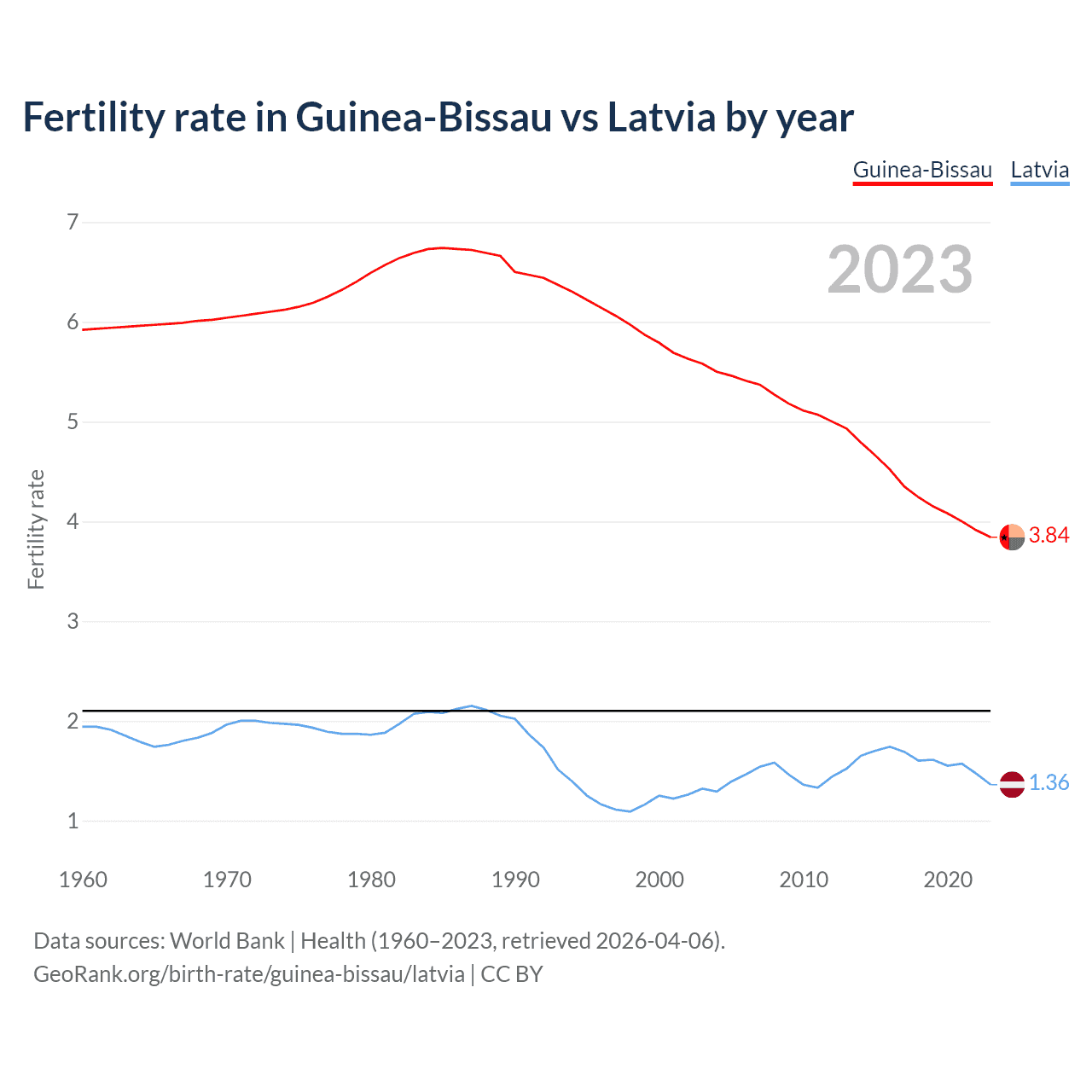 According to the latest available data on birth rates, the fertility rate in Guinea-Bissau was 3.84 children per woman in 2023, compared to 1.36 in Latvia in 2023. The replacement level is considered to be 2.1 children per woman.