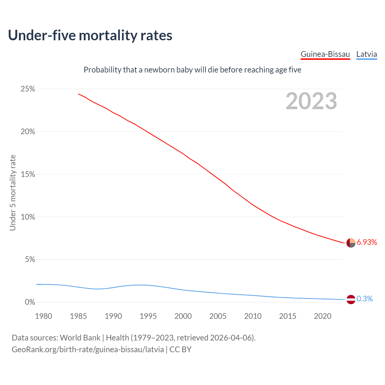 The chance that a newborn baby will die before reaching age five is 6.93% in Guinea-Bissau and 0.3% in Latvia. Above is a chart with historical data on under-five mortality rates.