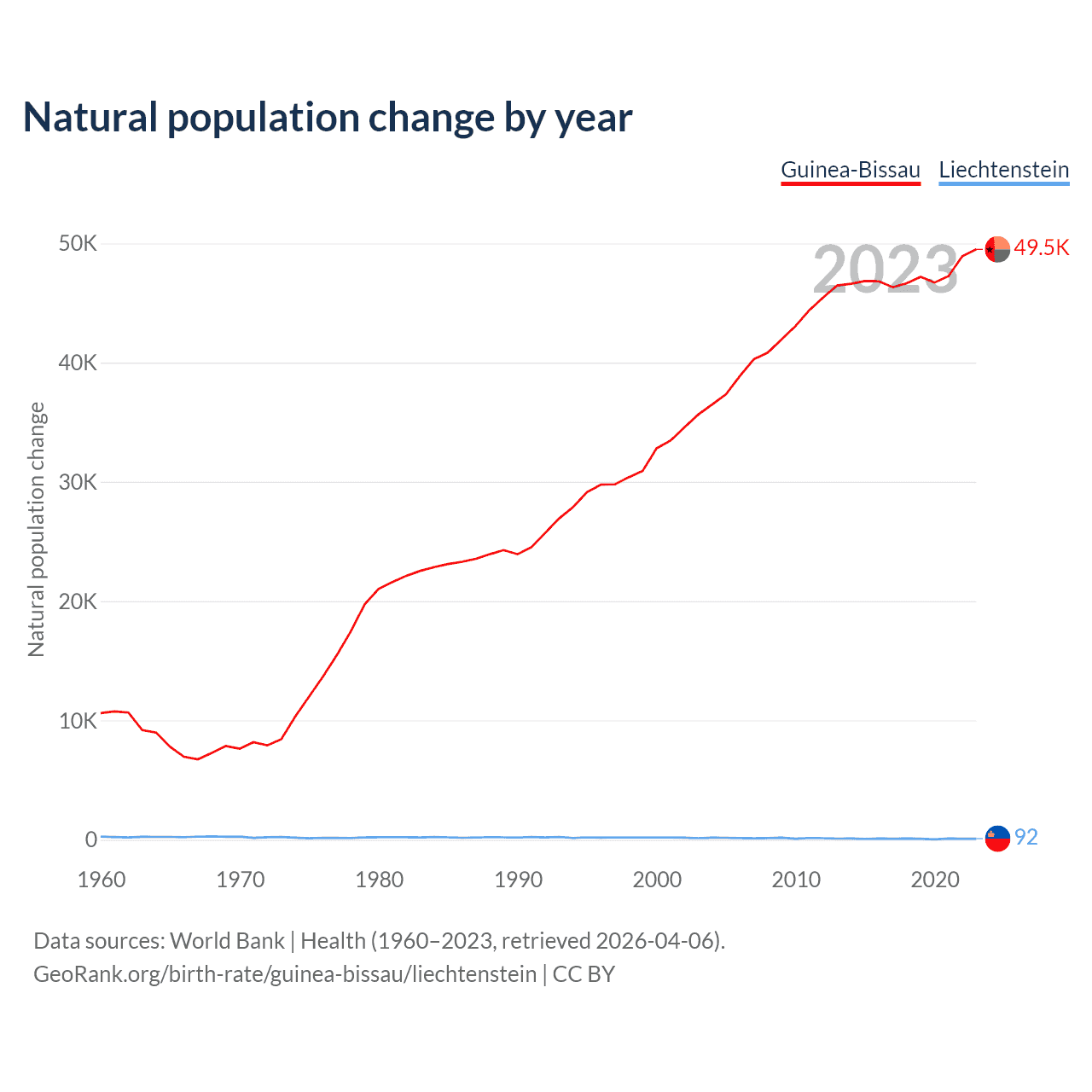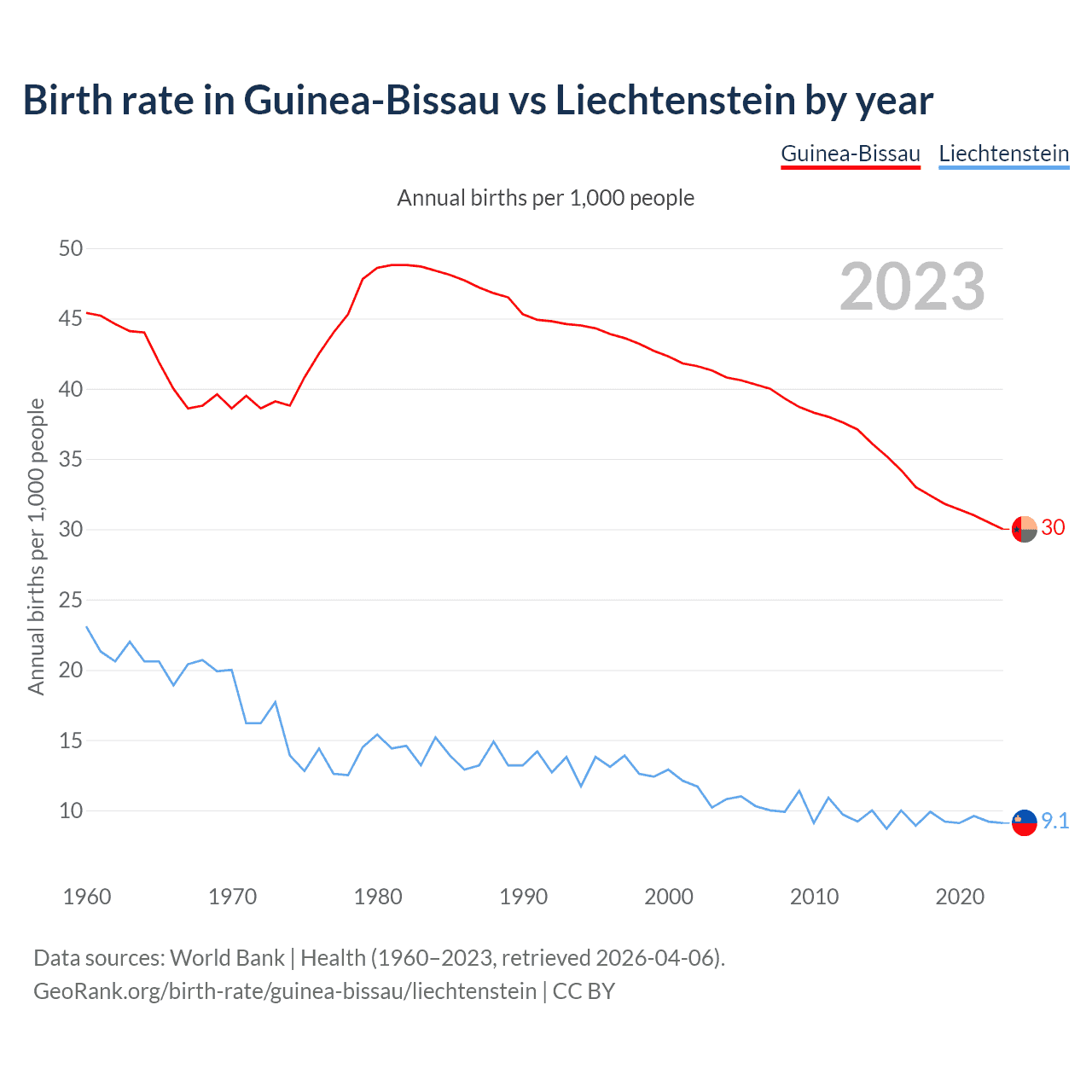 Guinea-Bissau has an annual birth rate of 30 births per 1,000 people, compared to 9.1 for Liechtenstein. The average number of children a woman is expected to have during her lifetime — the fertility rate, is 3.84 in Guinea-Bissau and 1.45 in Liechtenstein — 62.2% difference.