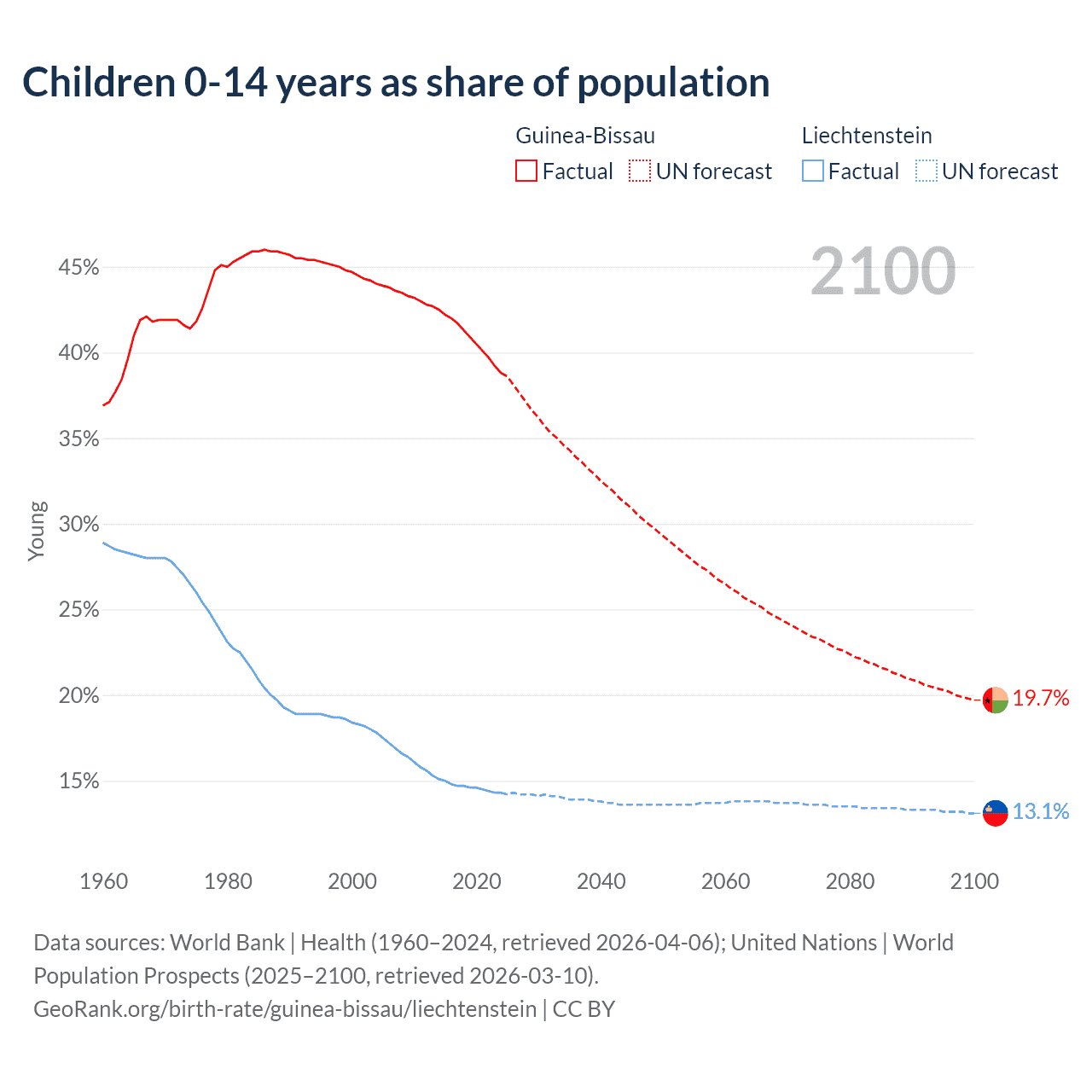 Children aged 0-14 make up 38.8% of the population in Guinea-Bissau and 14.3% in Liechtenstein in 2024, compared to 45.7% and 19.1% respectively in 1990.