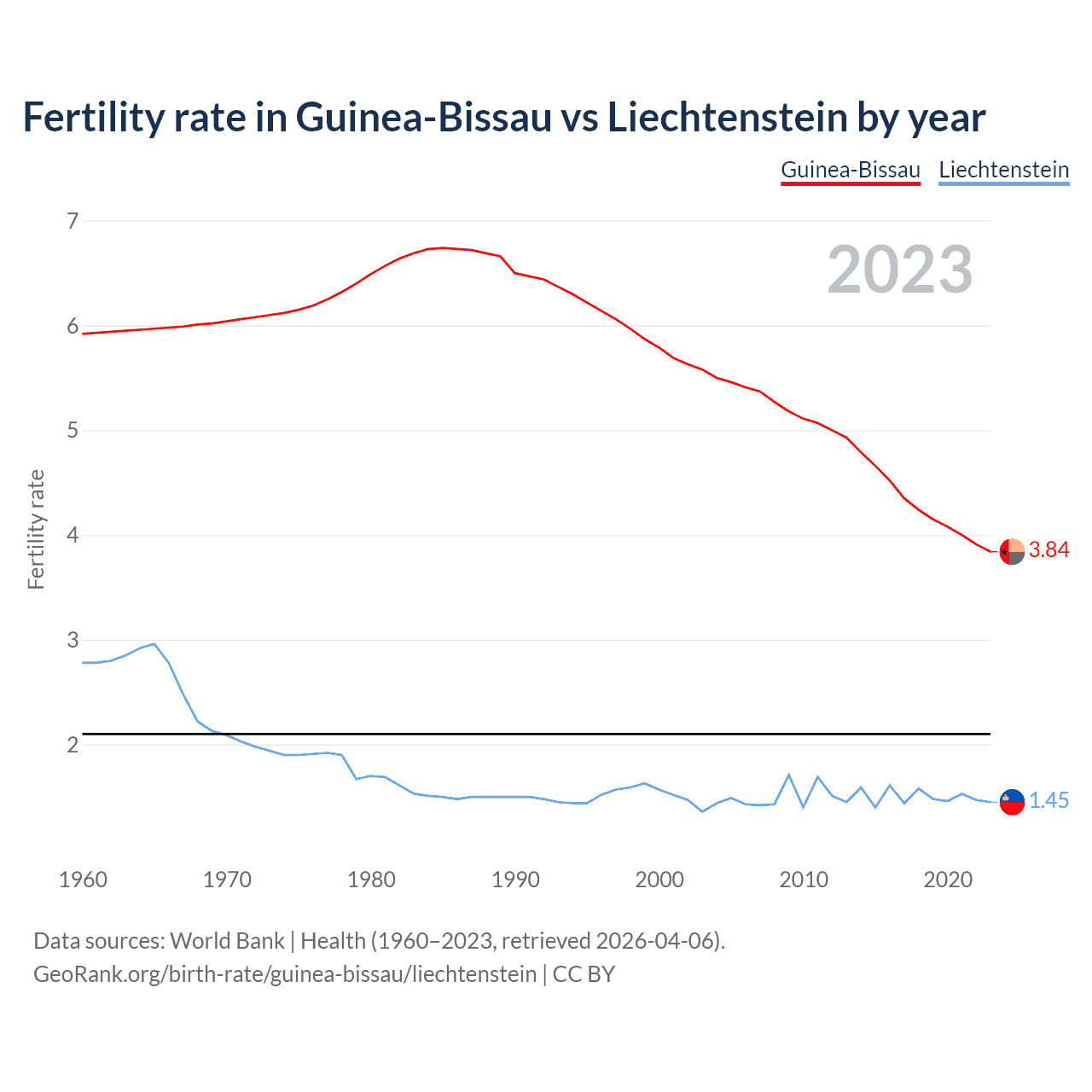 According to the latest available data on birth rates, the fertility rate in Guinea-Bissau was 3.84 children per woman in 2023, compared to 1.45 in Liechtenstein in 2023. The replacement level is considered to be 2.1 children per woman.