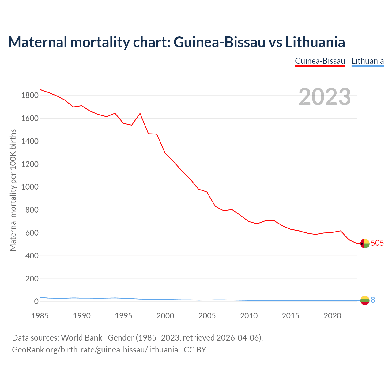 The maternal mortality rate, which is the probability of dying during childbirth or within 42 days of pregnancy termination, is 505 deaths per 100,000 live births in Guinea-Bissau, compared to 8 deaths in Lithuania.