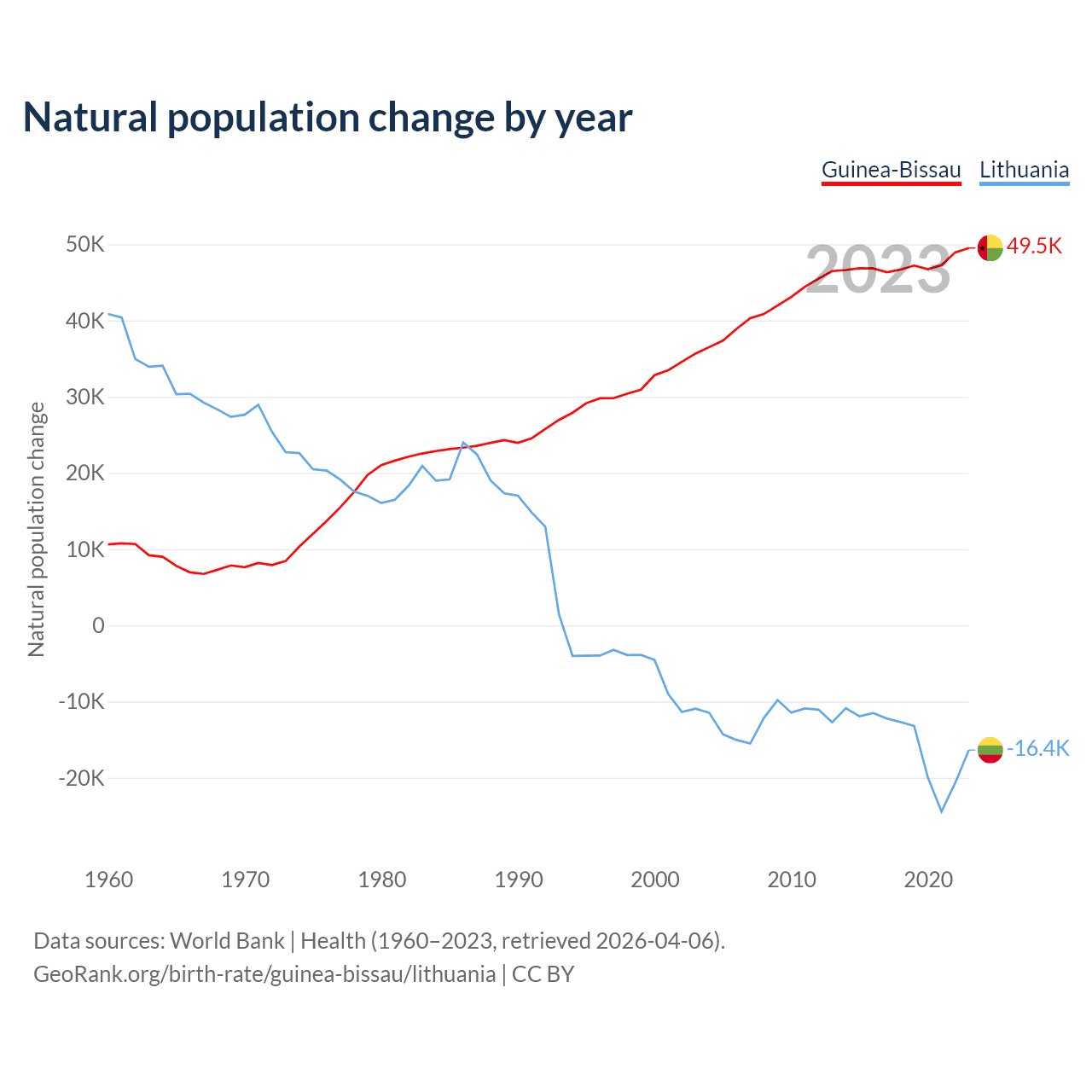 According to the latest available data on birth rates, the fertility rate in Guinea-Bissau was 3.84 children per woman in 2023, compared to 1.18 in Lithuania in 2023. The replacement level is considered to be 2.1 children per woman.