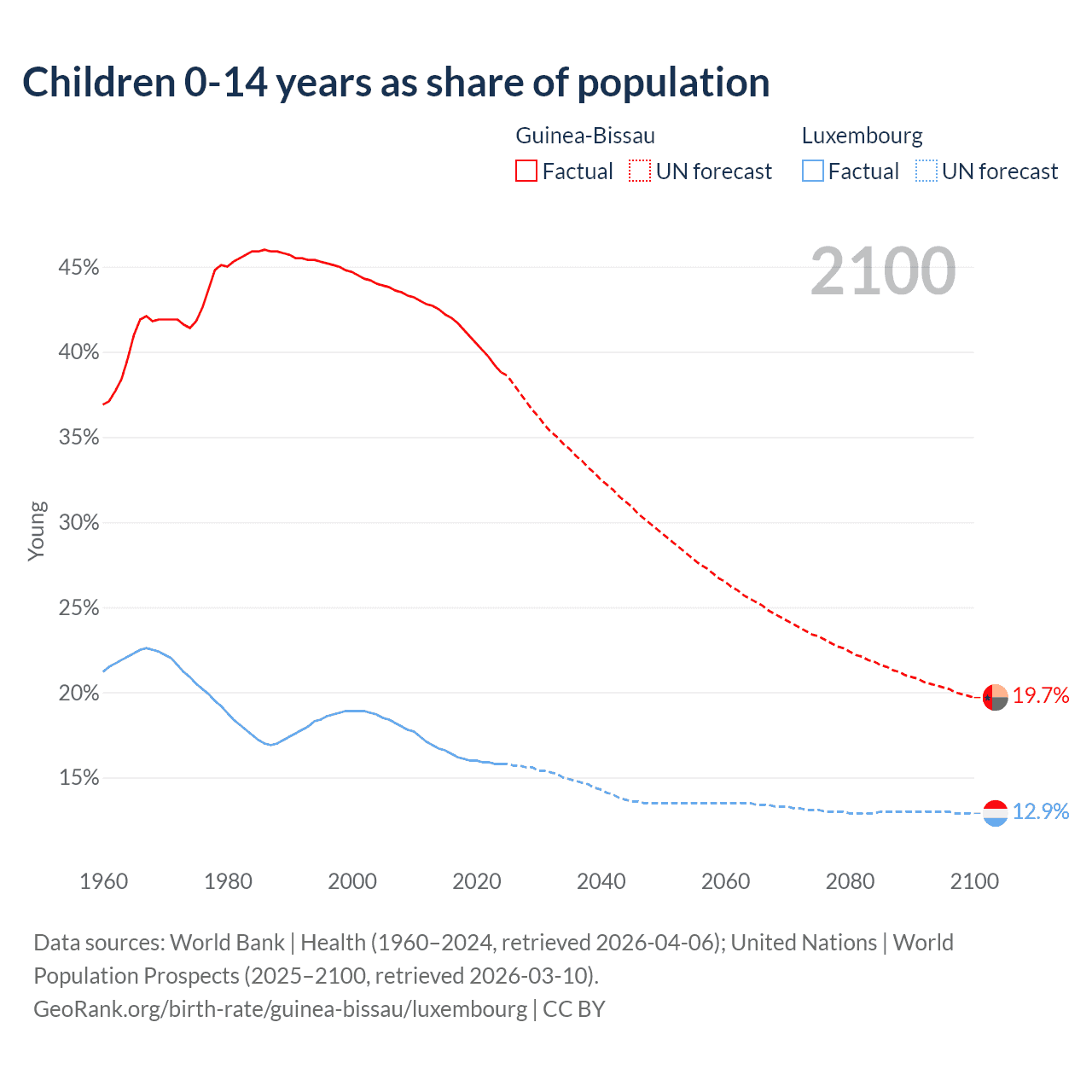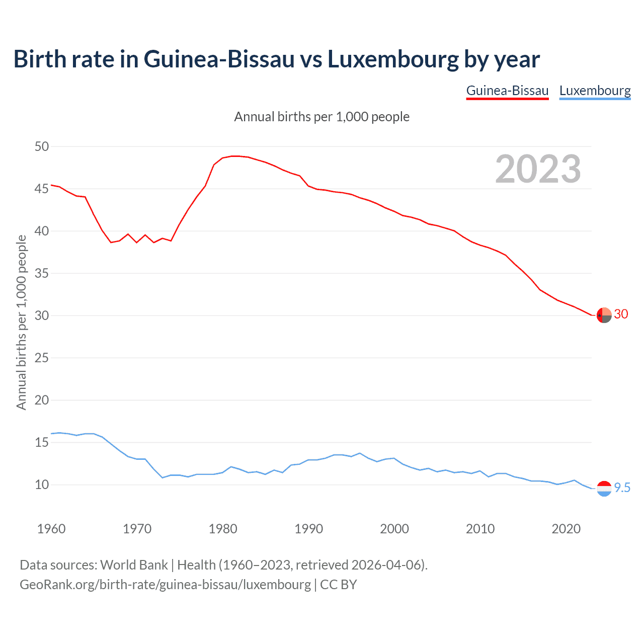 Guinea-Bissau has an annual birth rate of 30 births per 1,000 people, compared to 9.5 for Luxembourg. The average number of children a woman is expected to have during her lifetime — the fertility rate, is 3.84 in Guinea-Bissau and 1.25 in Luxembourg — 67.4% difference.